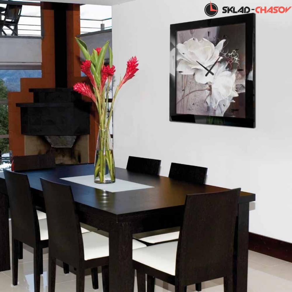 На циферблате квадратной формы черно-белое изображение красивого цветка.