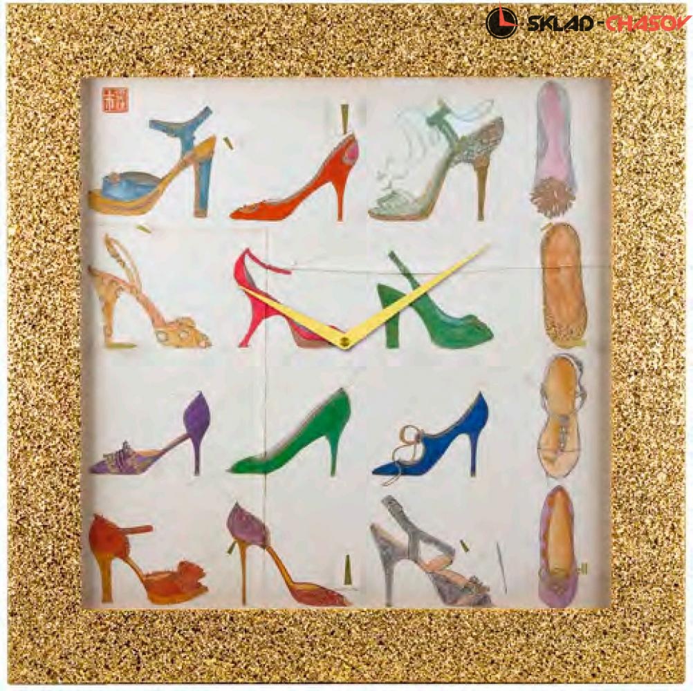 Циферблат представляет собой панель с художественной репродукцией, демонстрирующей женские туфли, отделанную блестящим золотым напылением.