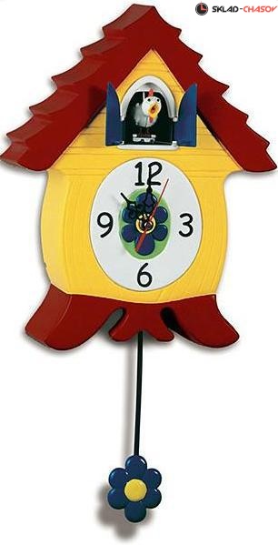 Корпус часов выполнен из пластика. "Кукушка"- фигурка курицы, кудахчет каждый час. Датчик освещенности автоматически отключает сигнал при наступлении темноты. Циферблат- белый, арабские цифры. Цвет корпуса- желтый, красный. Маятник- цветочек.