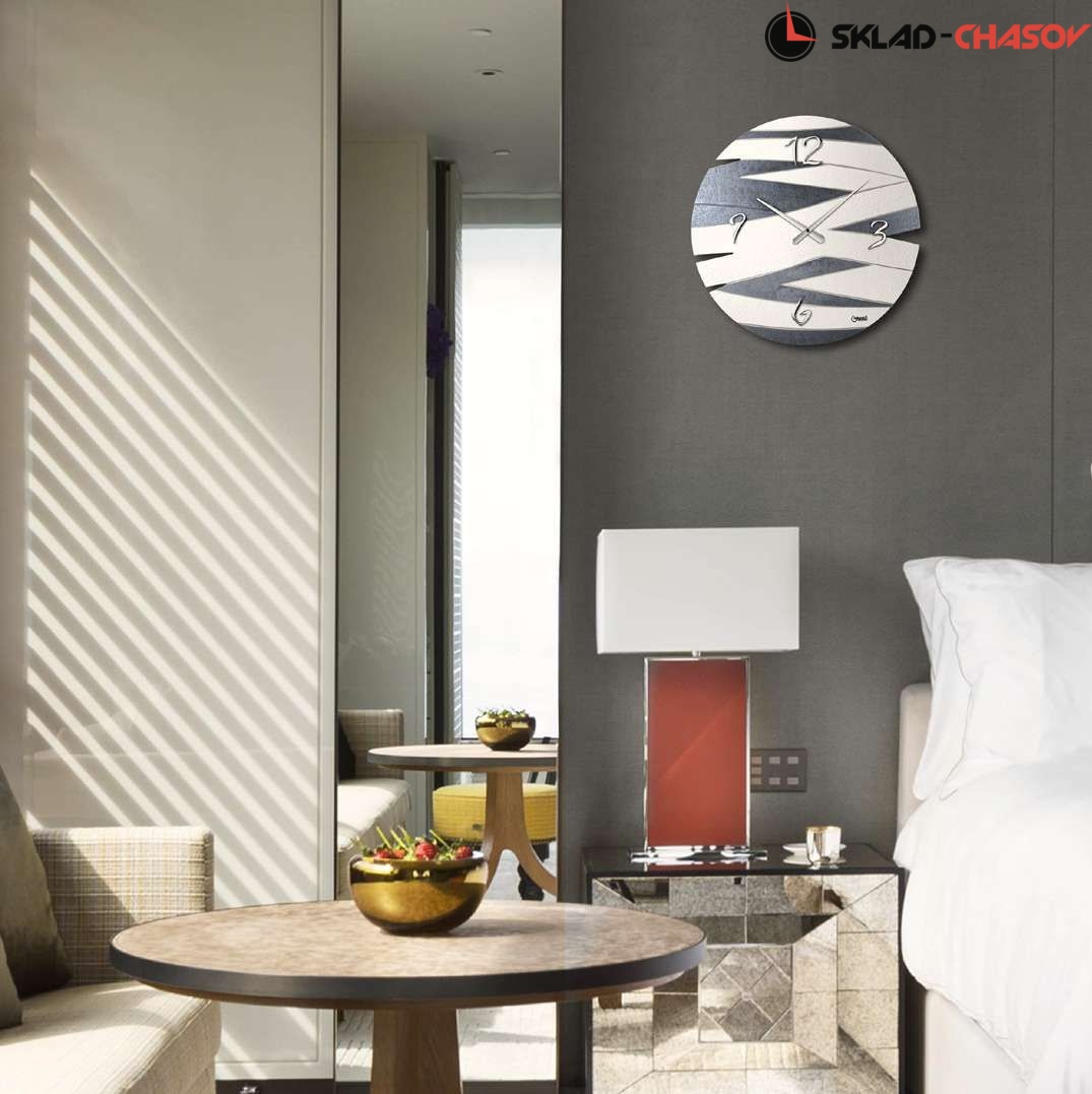 Настенные часы в деревянном корпусе. Поверхность корпуса выполнена с применением браширования по водоотталкивающему материалу. Цифры и метки произведены из хромированного алюминия и латуни.