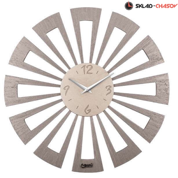 Настенные часы в деревянном корпусе. Поверхность корпуса выполнена с применением браширования по водоотталкивающему материалу.