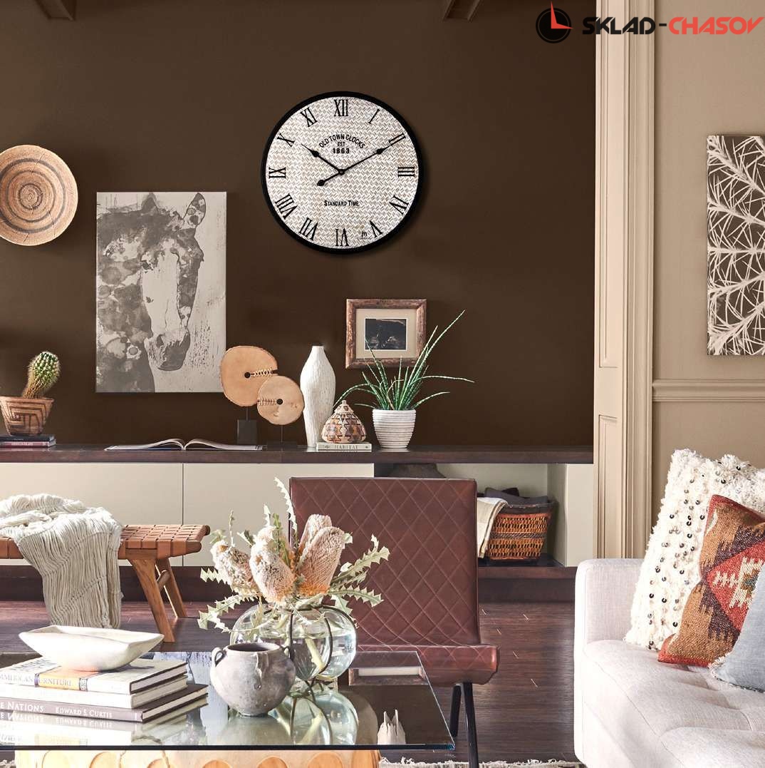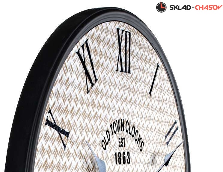 Кварцевые настенные часы большого диаметра. Металлический корпус.Циферблат выполнен из МДФ со стилизацией под рогожку. Необходим 1 элемент питания типа АА (в комплект не входит).