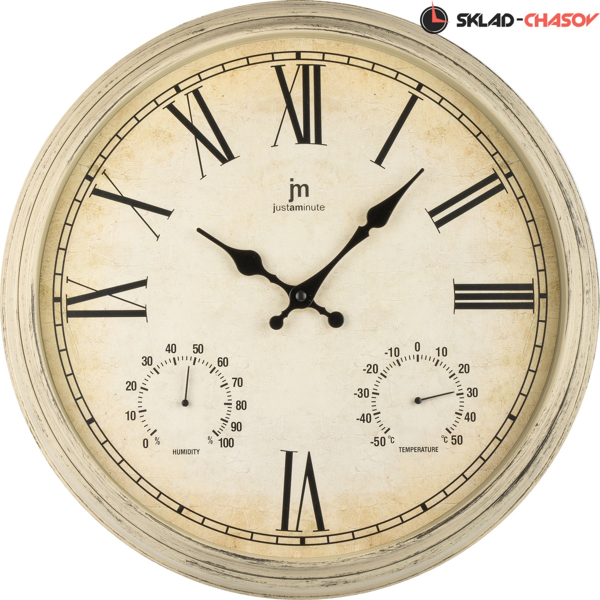 Кварцевые настенные часы с термометром и гигрометром. Объемный корпус изготовлен из пластика, искусственно состарен.