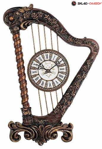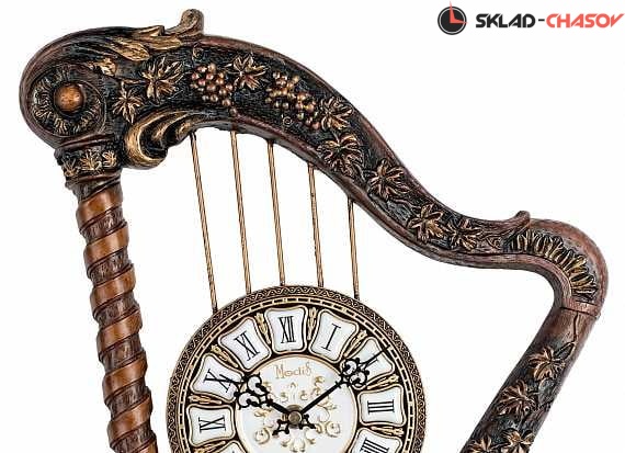 Настенные часы Modis прекрасно отражают дух музыки: небольшой круглый циферблат с римскими обозначениями и изящными стрелками крепится на струнах арфы, украшенной ажурным декором в виде резных виноградных лоз и колонны. Часы с кварцевым механизмом изготовлены из искусственного камня.