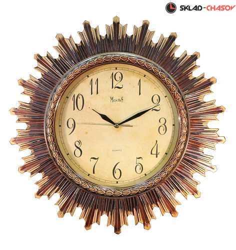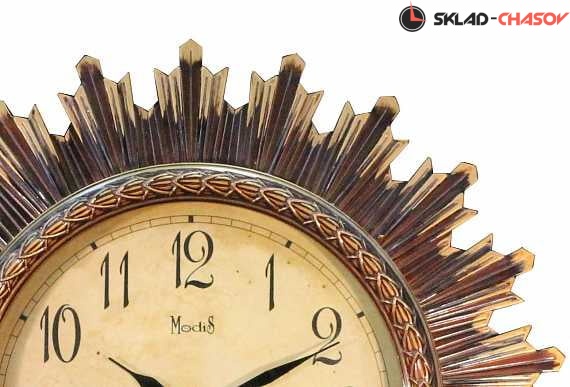 Окруженные золотисто-янтарным ореолом стилизованных лучей настенные часы Modis имеют сдержанный винтажный циферблат. Часы с кварцевым механизмом изготовлены из пластика и выполнены в оттенке античного золота.