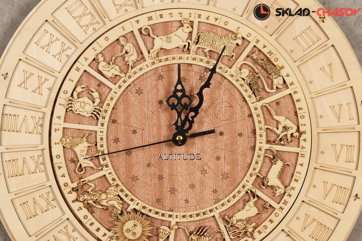 Настенные интерьерные часы от немецкого дизайнера Фридриха Кельна. Необычный дизайн украшает пространство стильного загородного дома или современной роскошной квартиры. «Часы могут быть гороскопом» - вот идея создания. Изготовлено из натурального дерева, часы с кварцевым механизмом, деревянные насечки изображений знаков зодиака, а также римские цифры.
