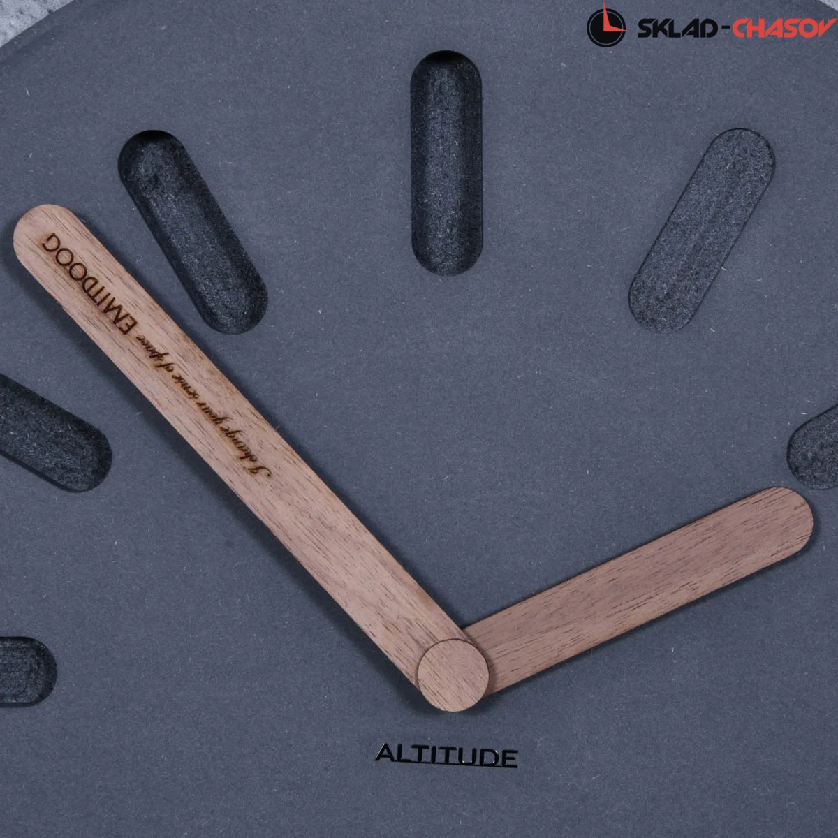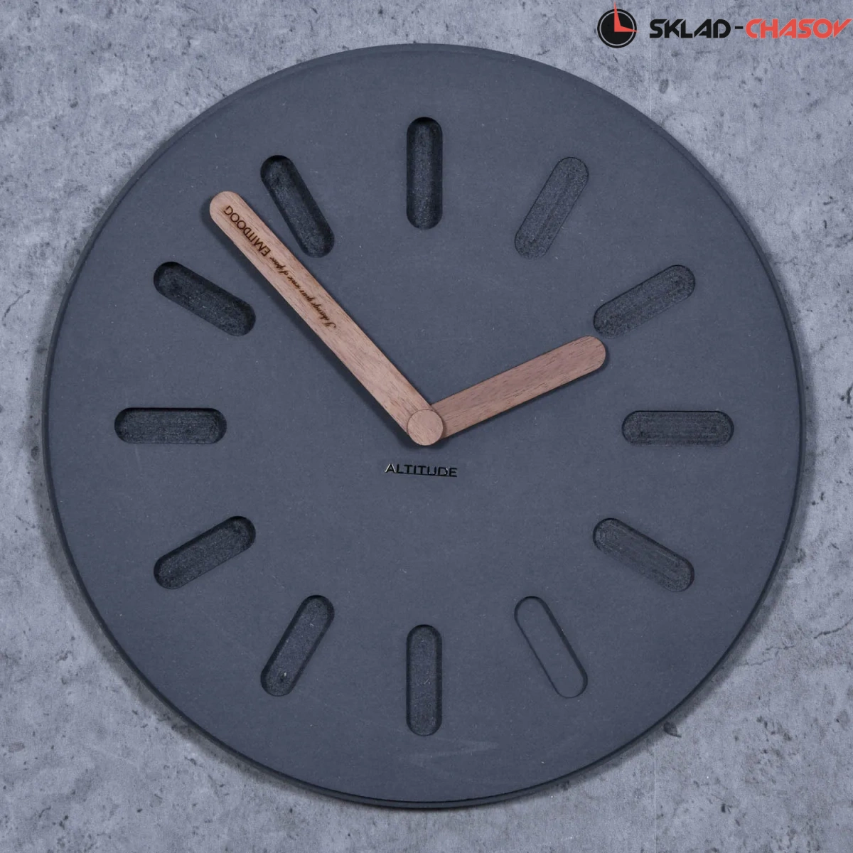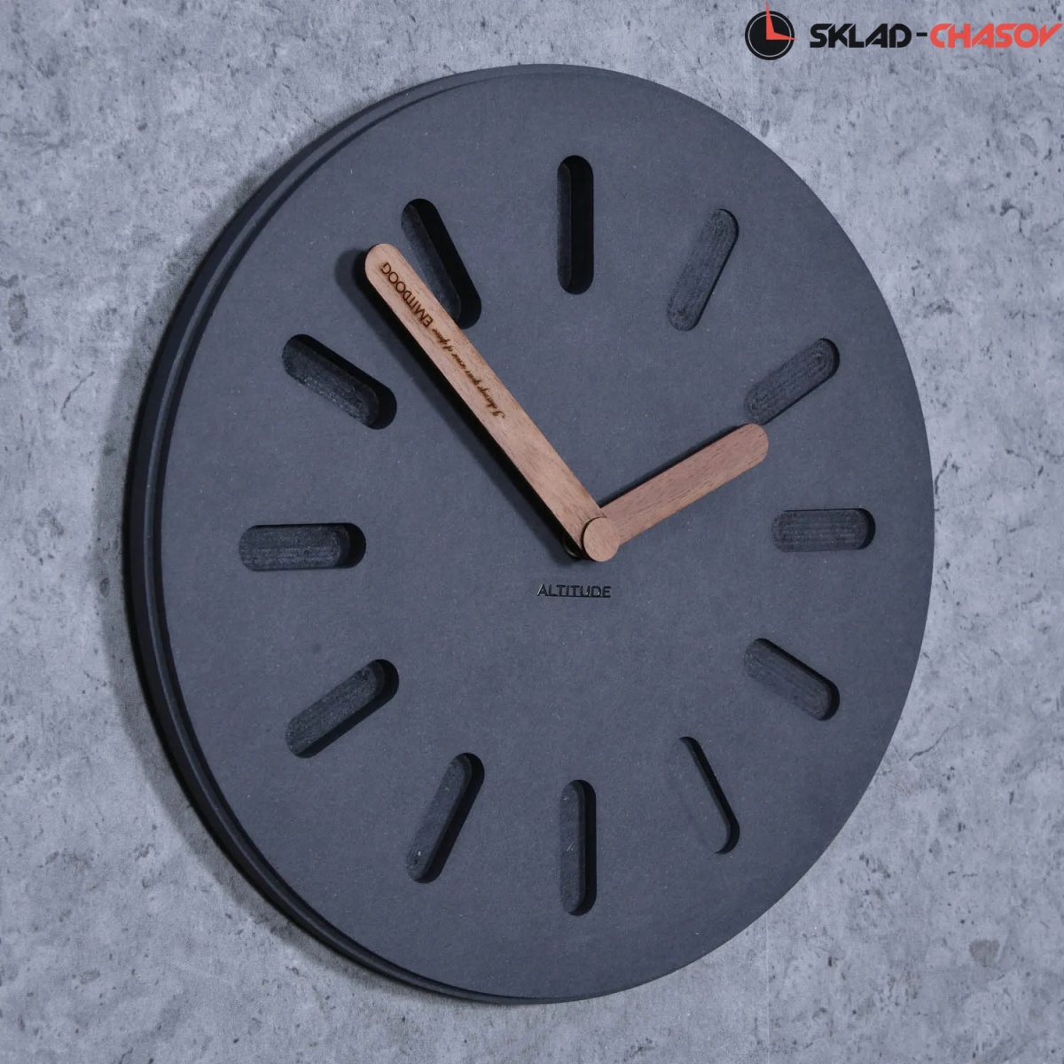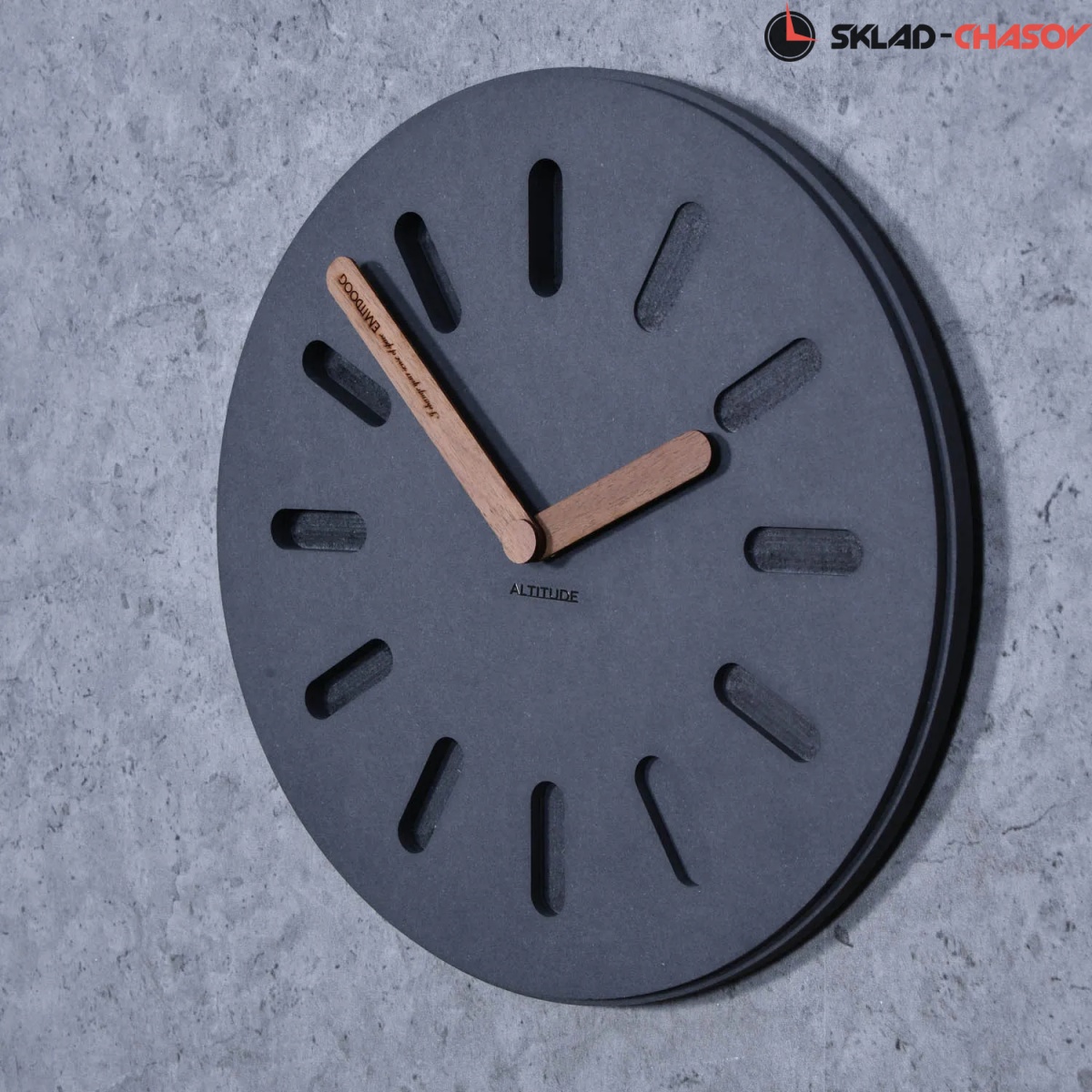Настенные интерьерные часы от немецкого дизайнера Фридриха Кельна. Необычный дизайн украшает пространство стильного загородного дома или современной роскошной квартиры. «Часы в стиле лофт» - вот идея создания. Изготовлено из мдф темно-серого цвета, отделяют дизайн деревянных стрелок с метками времени, часы с кварцевым механизмом, цифры показывают время.