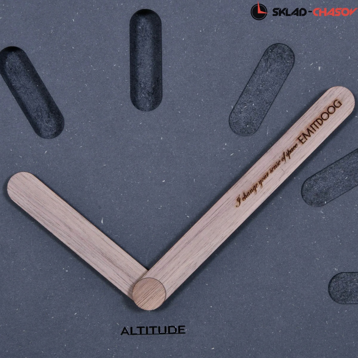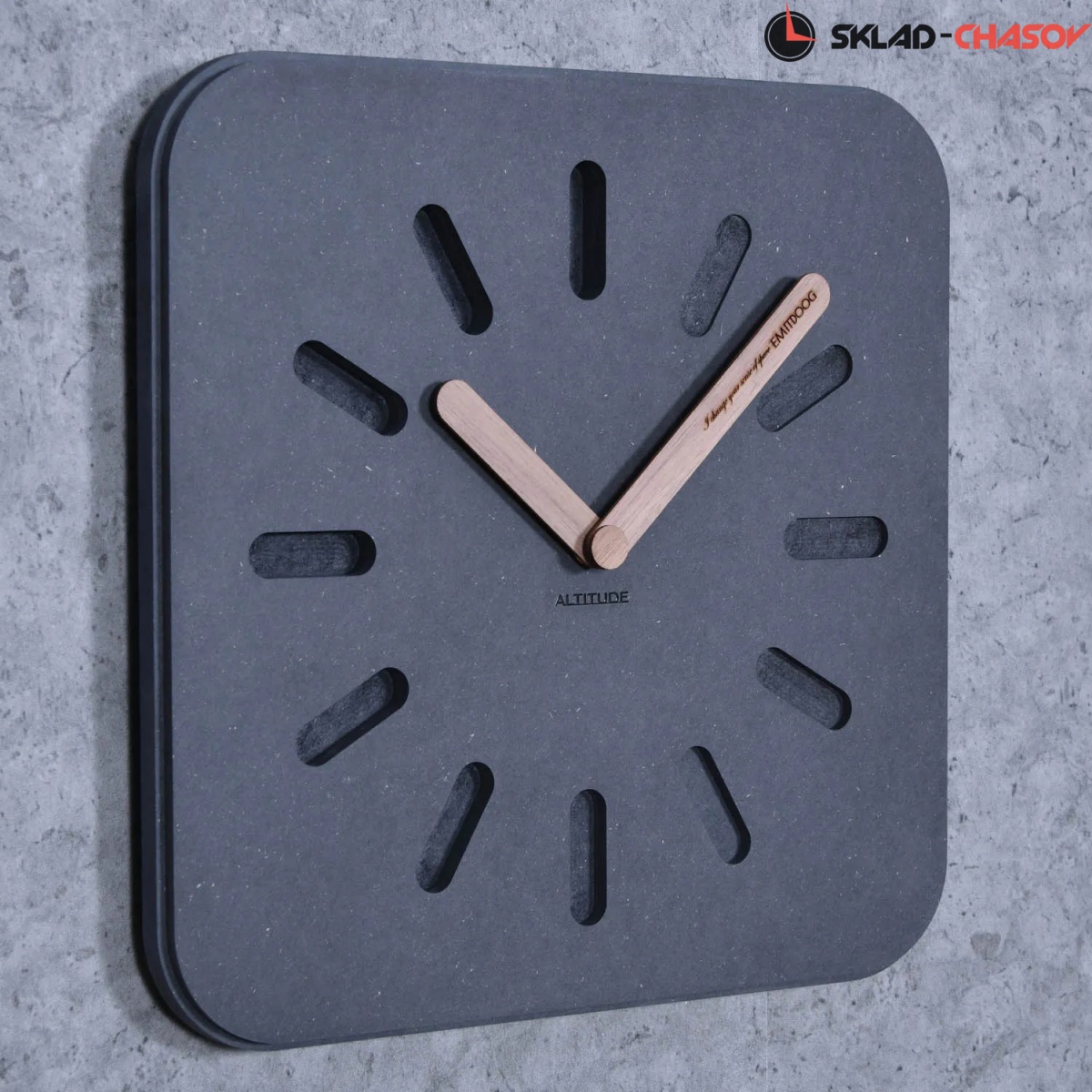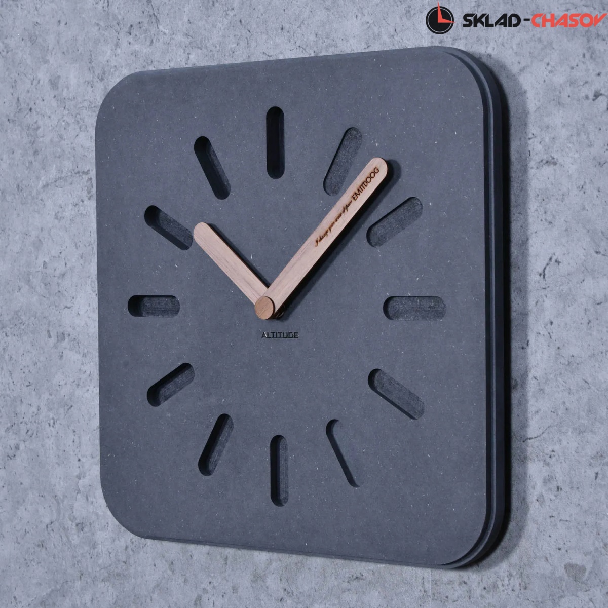 Настенные интерьерные часы от немецкого дизайнера Фридриха Кельна. Необычный дизайн украшает пространство стильного загородного дома или современной роскошной квартиры. «Часы в стиле лофт» - вот идея создания. Изготовлено из мдф темно-серого цвета, отделяют дизайн деревянных стрелок с метками времени, часы с кварцевым механизмом, цифры показывают время.