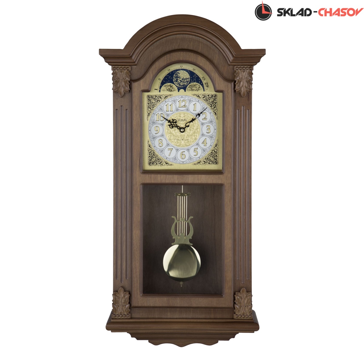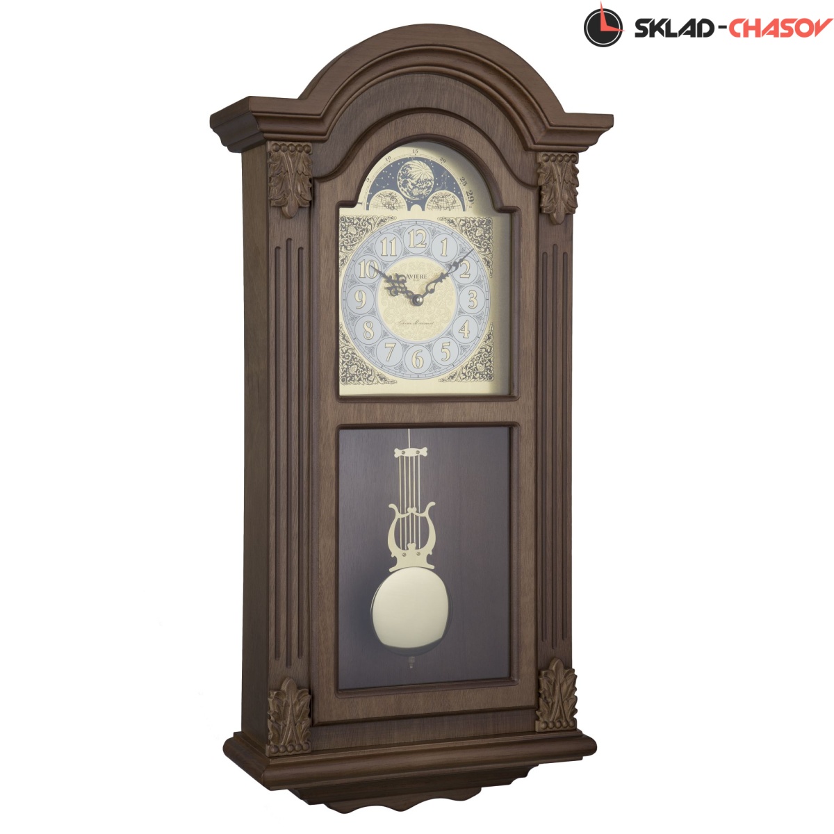 Корпус часов выполнен из МДФ и покрыт шпоном твердых пород дерева и тонирован в цвете орех.