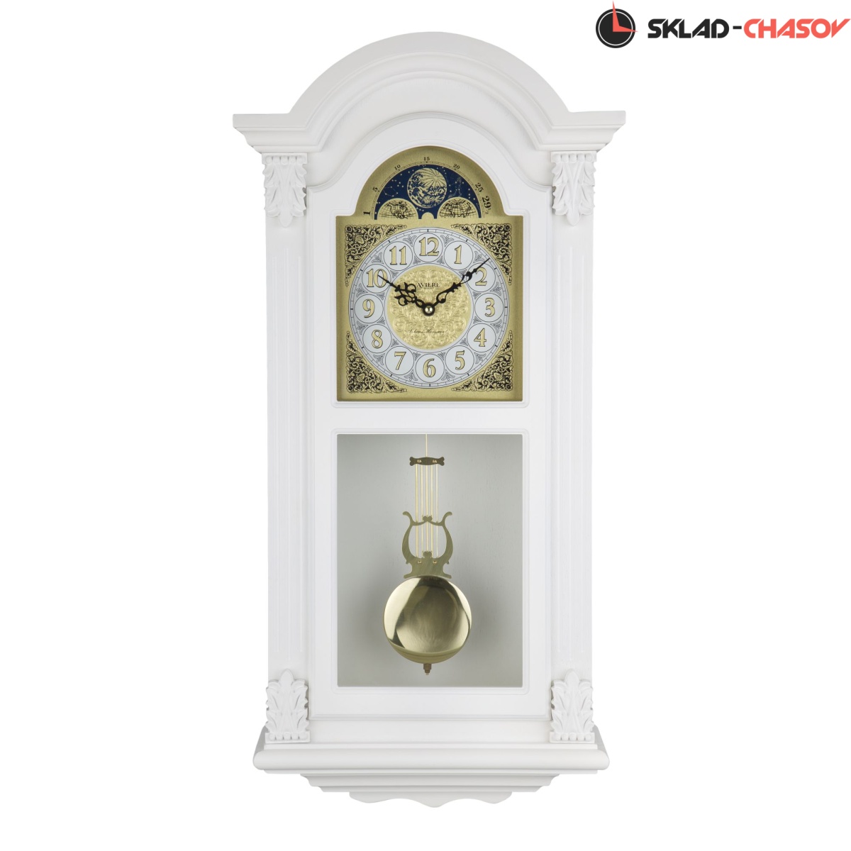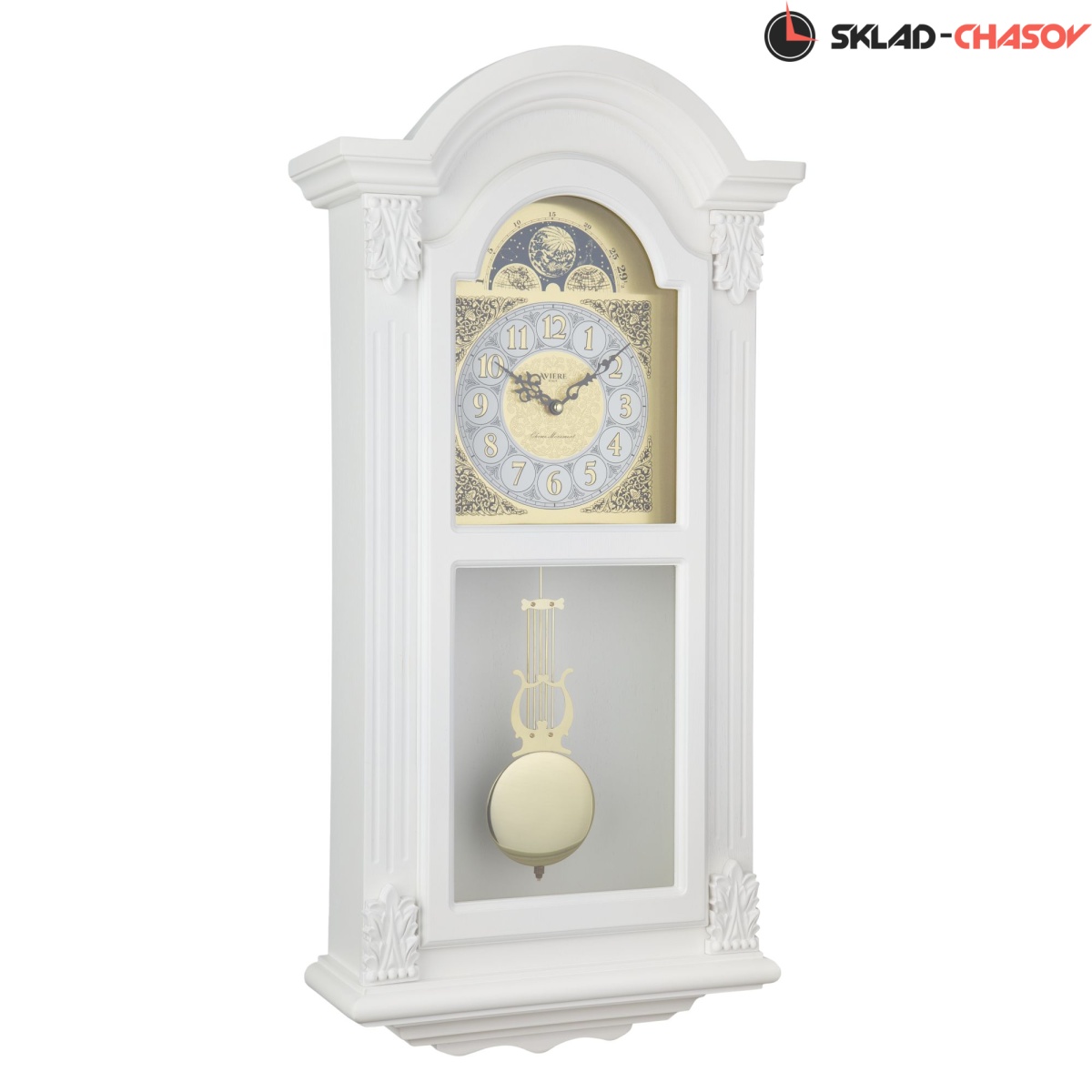 Корпус часов выполнен из МДФ и покрыт шпоном твердых пород дерева и тонирован в белом цвете.