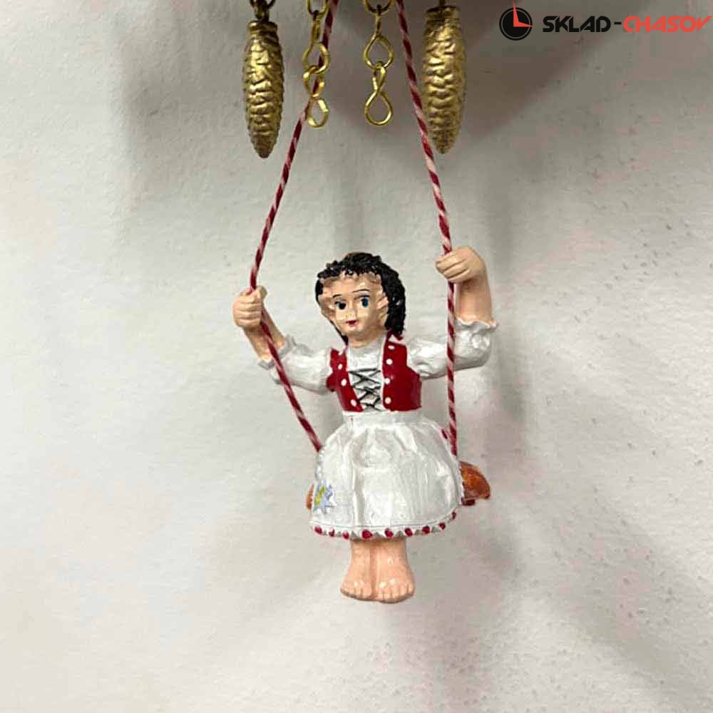 Механизм: кварцевый. Размер: 19x12x8 см. Высота без учета маятника: 19 см Корпус: дерево. Девочка качается на качелях.