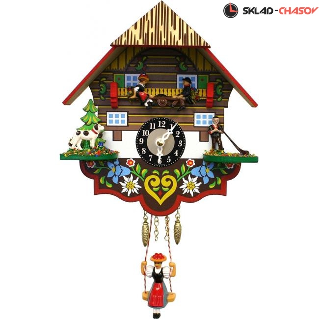 Корпус собран опытными мастерами своего дела в Германии, декорирован резными элементами тонкой ручной работы и украшен ручной росписью. Модель в виде домика с фигурками собаки, мужчины и кукушкой наверху.