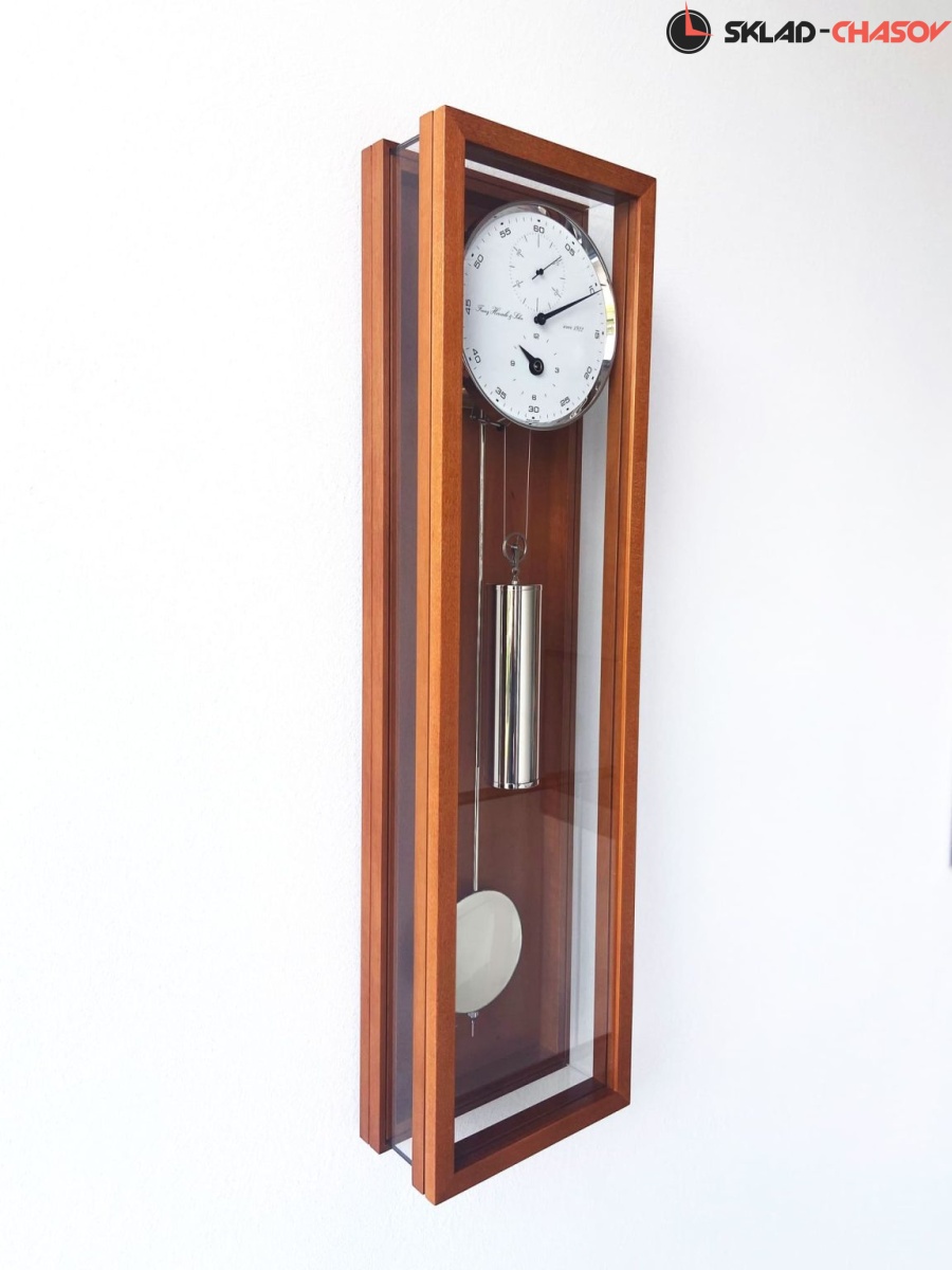 Ультрасовременный механизм для измерения месячных в минималистичном, но очень функциональном дизайне, с оптимальным обзором механизма для измерения месячных Hermle 0761. Особая филигранная конструкция отличается от всех предыдущих корпусов благодаря круглому остеклению из белого стекла. Высококачественное покрытие лаком традиционно обработанного массива дерева подчеркивает высокую ценность часов. Герметичные дверцы с элегантными петлями и магнитными защелками - еще одна деталь высокого качества. Также следует подчеркнуть особый выбор отделки поверхностей, как натуральным деревом, так и модными цветами, подобранными со вкусом. Прецизионный маятниковый механизм с 31-дневным запасом хода. Зубчатая передача установлена на 6 шарикоподшипниках и 6 рубиновых камнях.