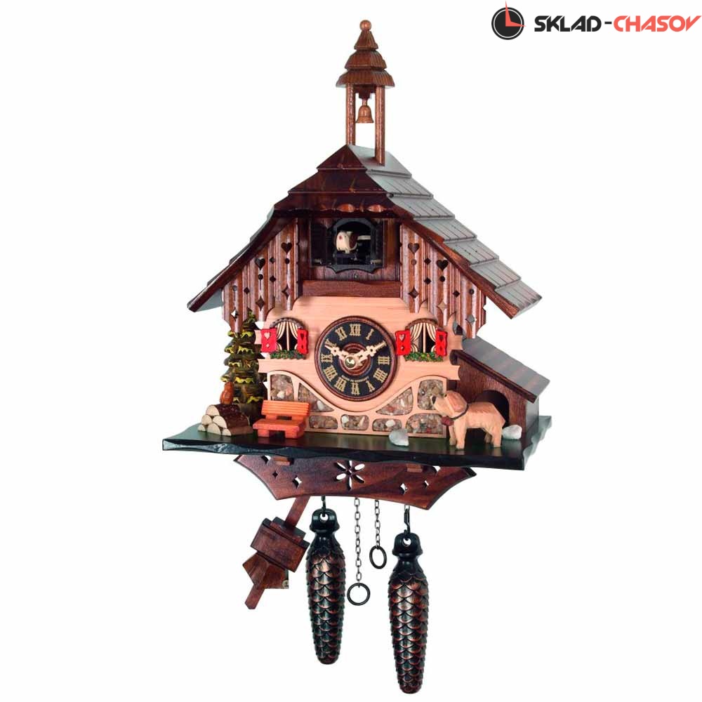 - Корпус выполнен из натурального дерева, собран очень качественно опытными мастерами своего дела, декорирован резными элементами тонкой ручной работы и украшен ручной росписью. Можно повесить как на стену, так и поставить на стол. Модель в виде шварцвальдского домика с колокольчиком на крыше, елочкой, скамейкой и собакой перед будкой.