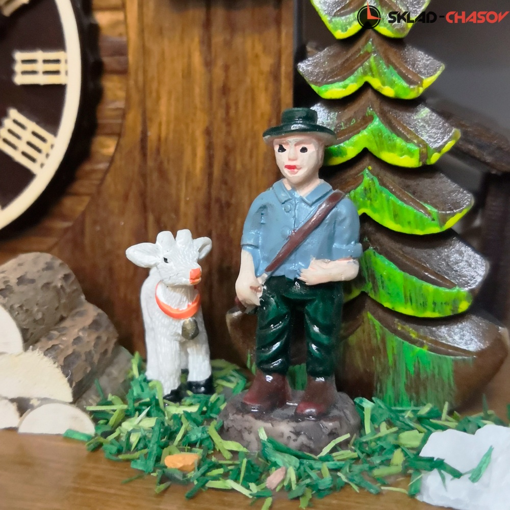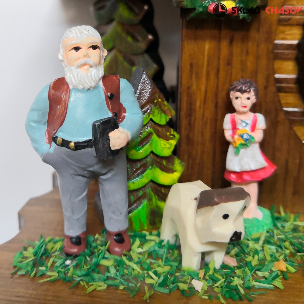 - Корпус выполнен из натурального дерева, собран очень качественно опытными мастерами своего дела, декорирован резными элементами тонкой ручной работы и украшен ручной росписью. Модель с фигурками дедушки, козочки, собачки, девочки, мальчика и елочек.
