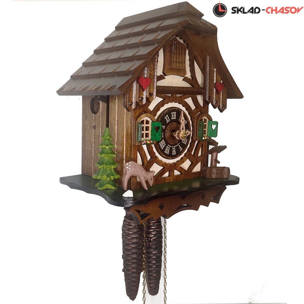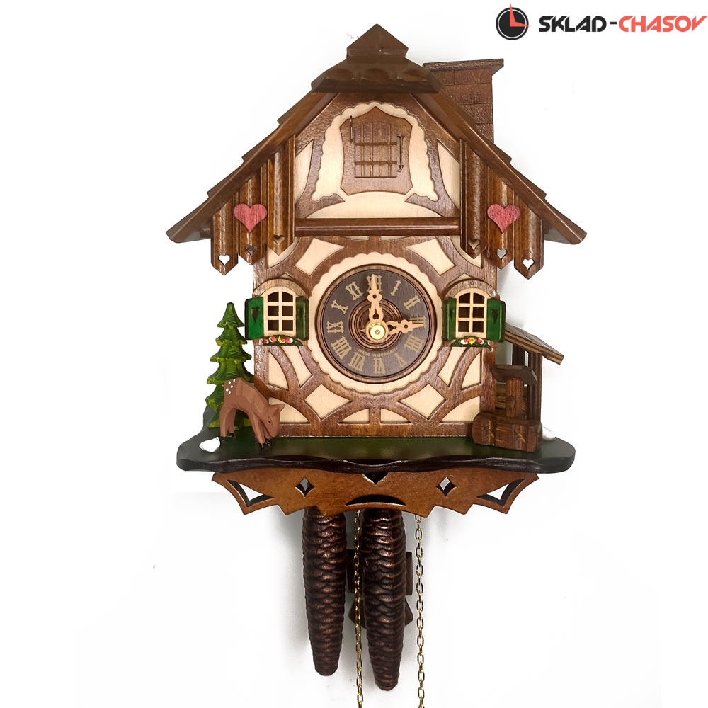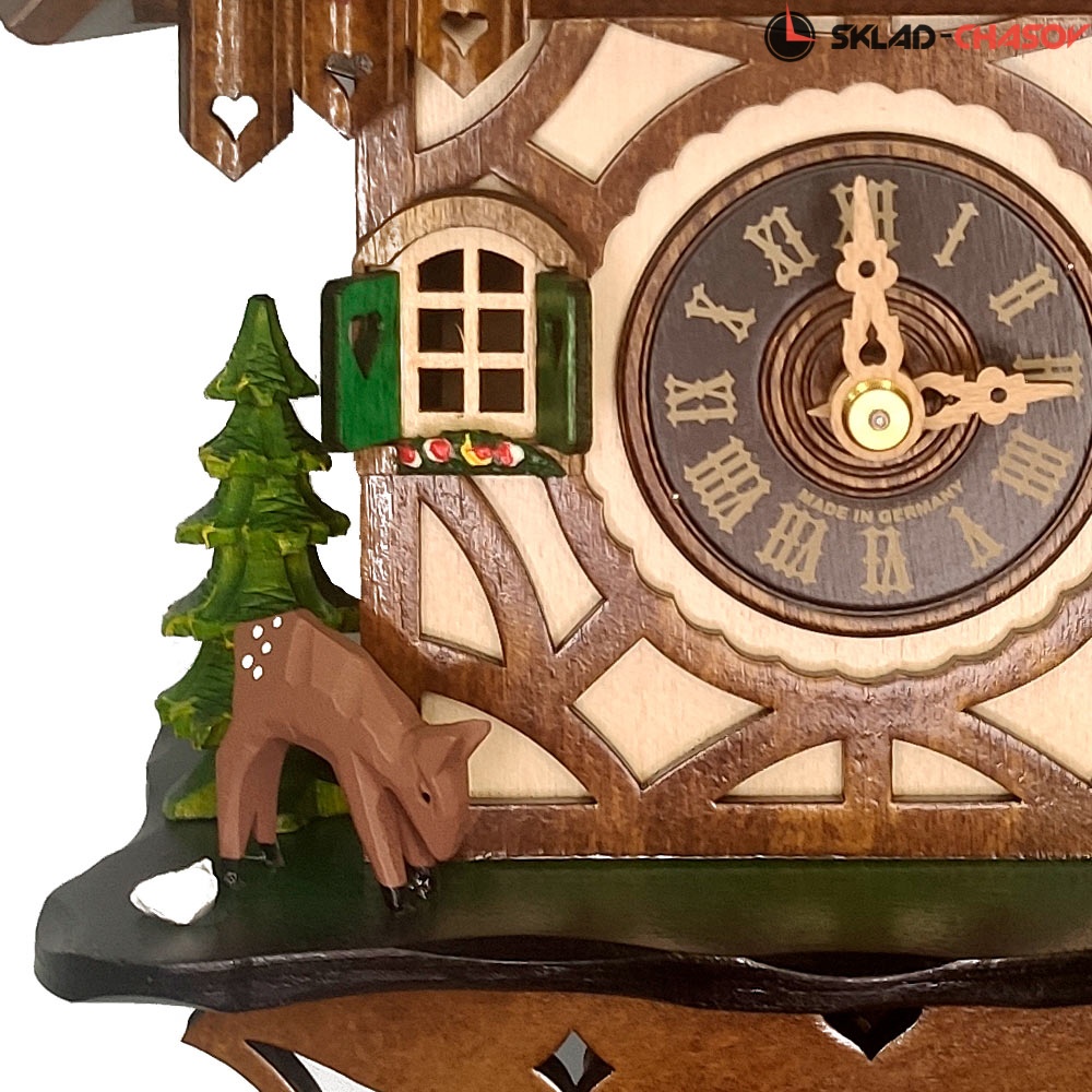 - Корпус выполнен из натурального дерева, собран очень качественно опытными мастерами своего дела, декорирован резными элементами тонкой ручной работы и украшен ручной росписью. Модель с елочкой, олененком и водяной колонкой. Трубочист появляется из трубы при каждом куковании.