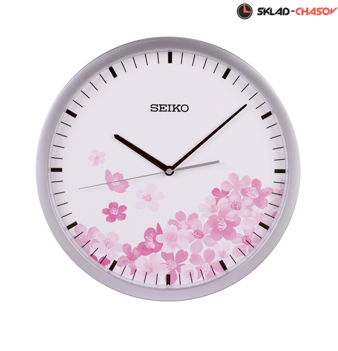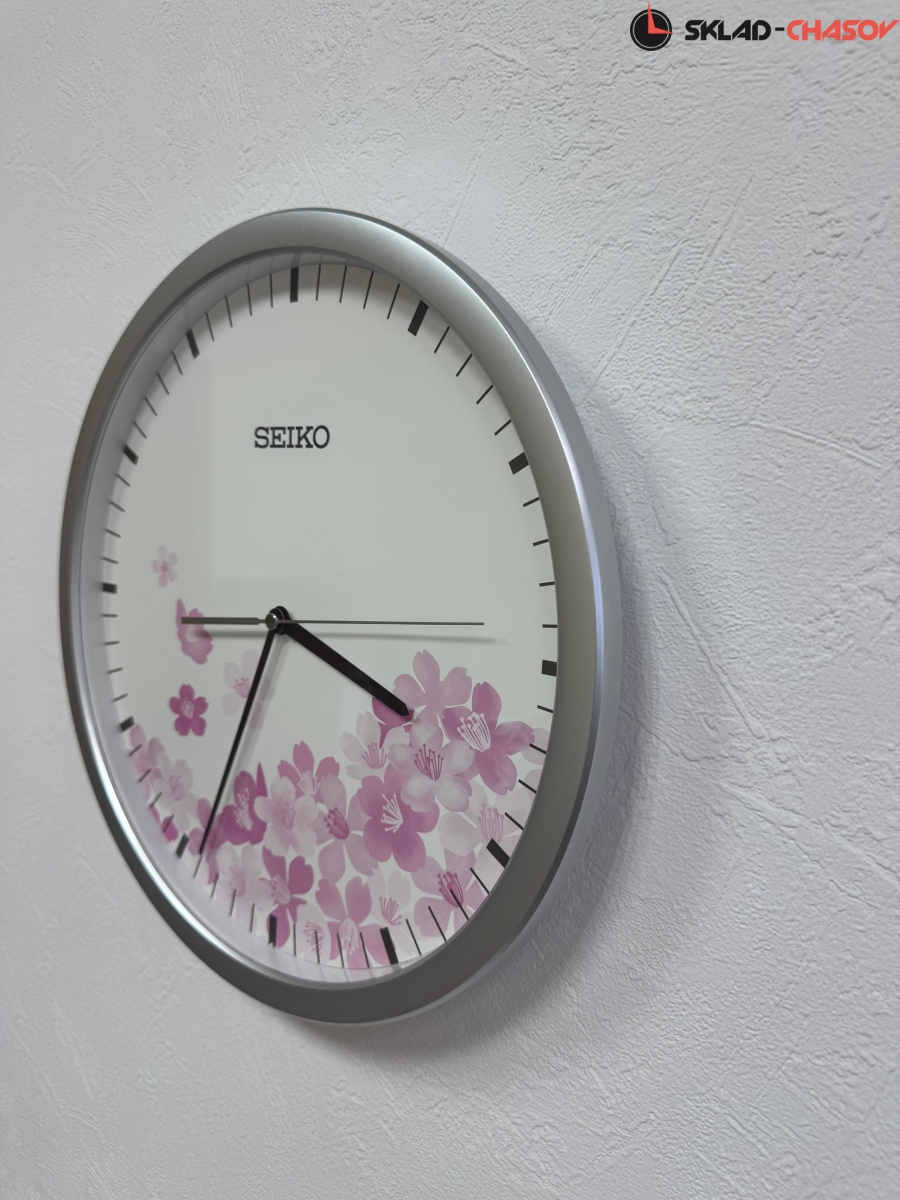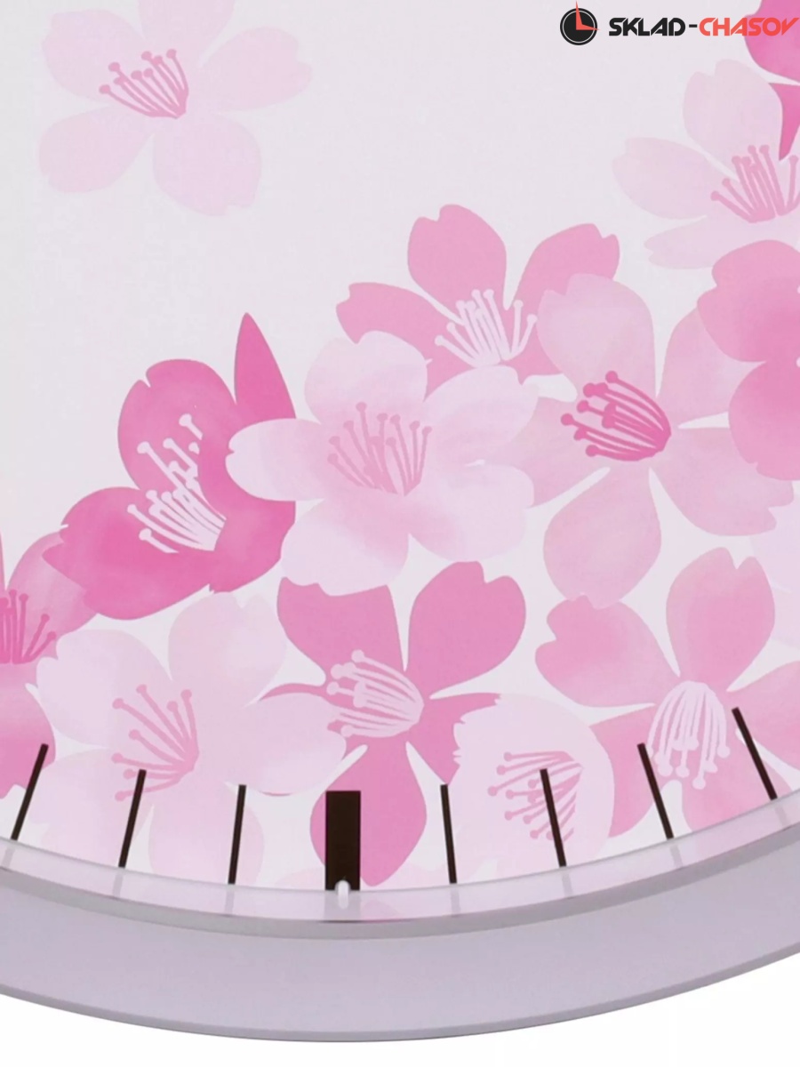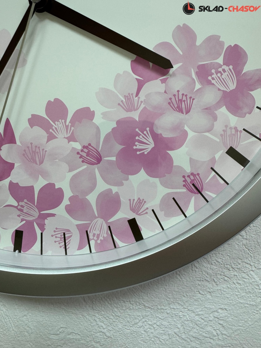 Серебристые настенные кварцевые часы с аналоговым циферблатом (стрелки). Стрелки: черная часовая, черная минутная и серебристая секундная. Циферблат с цветами закрыт стеклом. Временные рамки отображены визирами (черточками). Корпус выполнен из пластика.