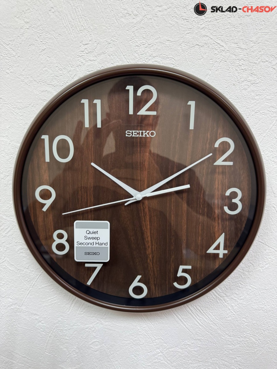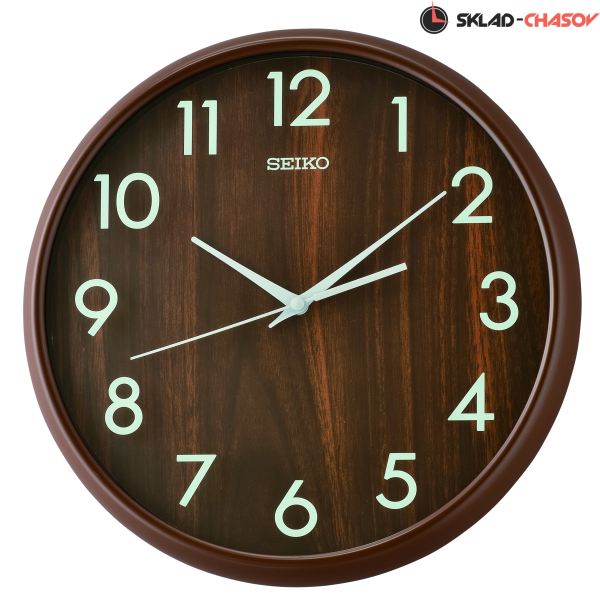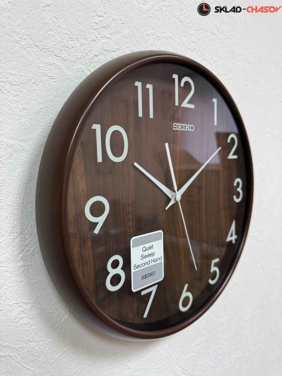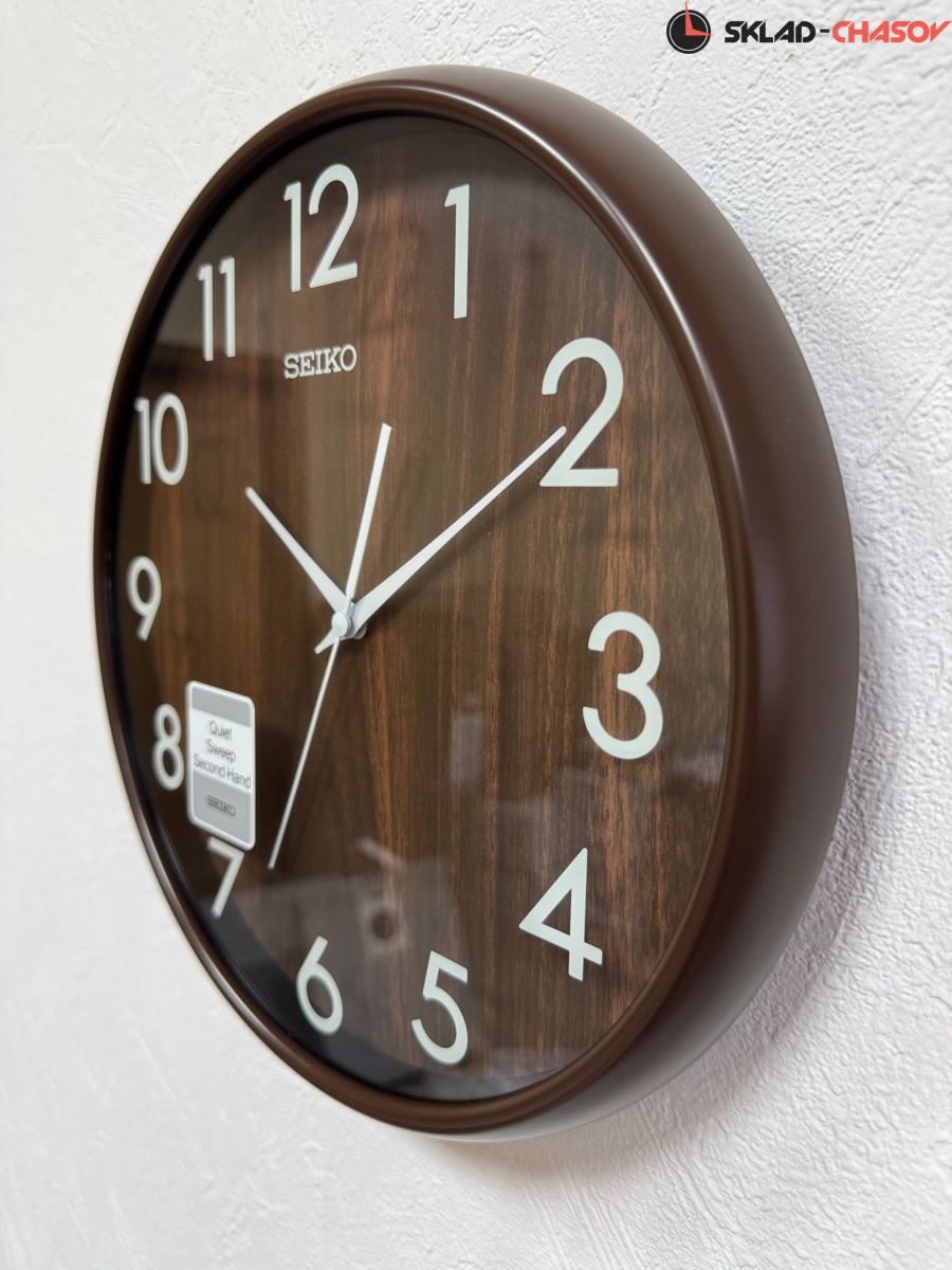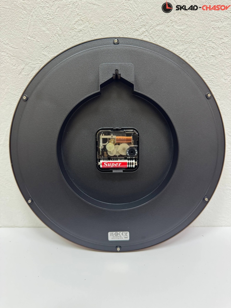 Коричневые настенные кварцевые часы с аналоговым циферблатом (стрелки). Циферблат под дерево с арабскими цифрами, закрыт стеклом. Плавный ход секундной стрелки. Бесшумный механизм. Корпус выполнен из пластика.