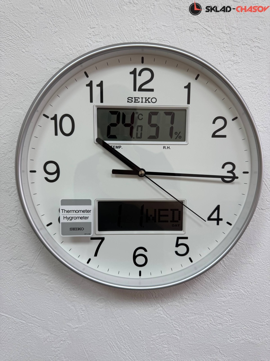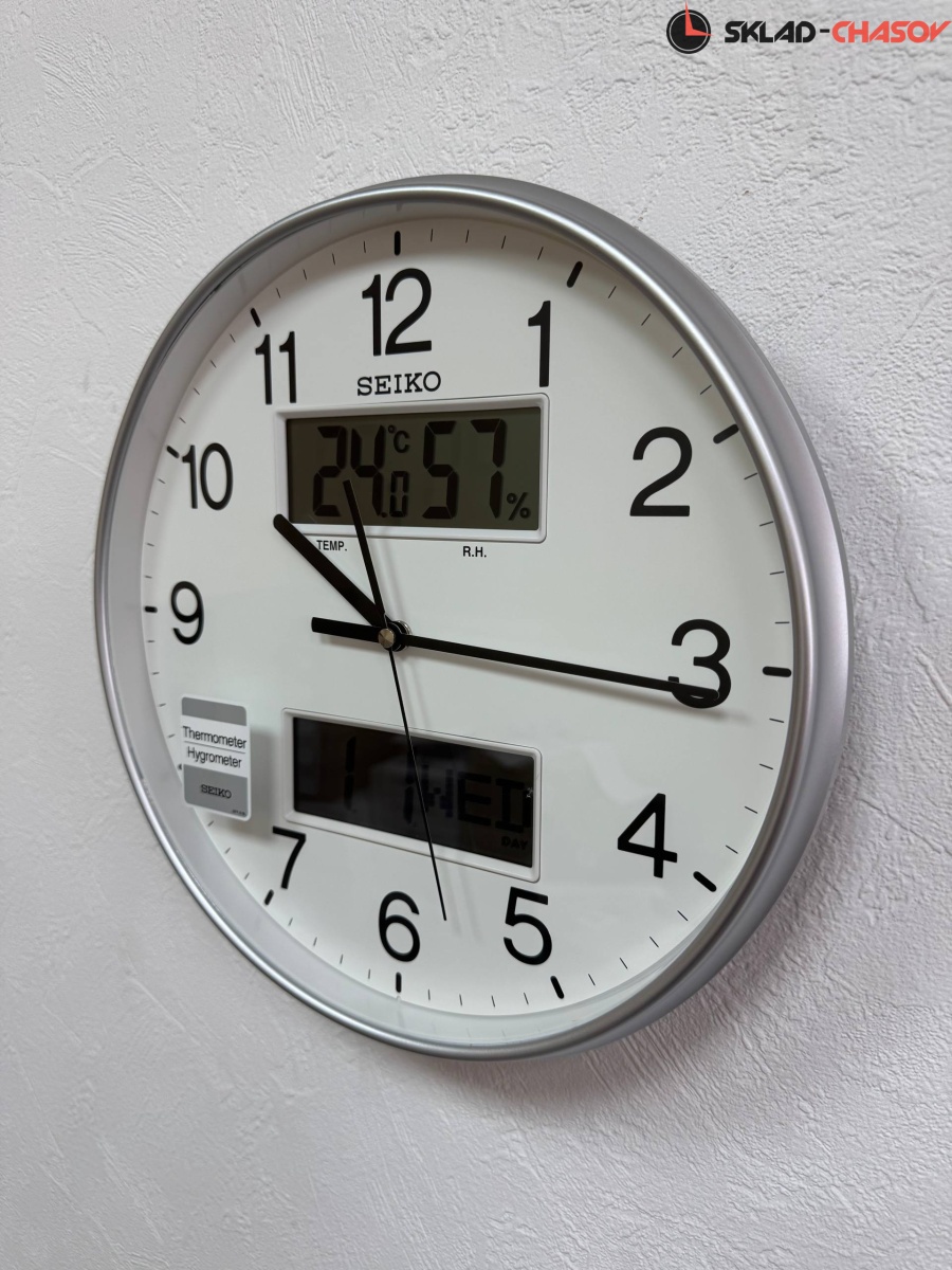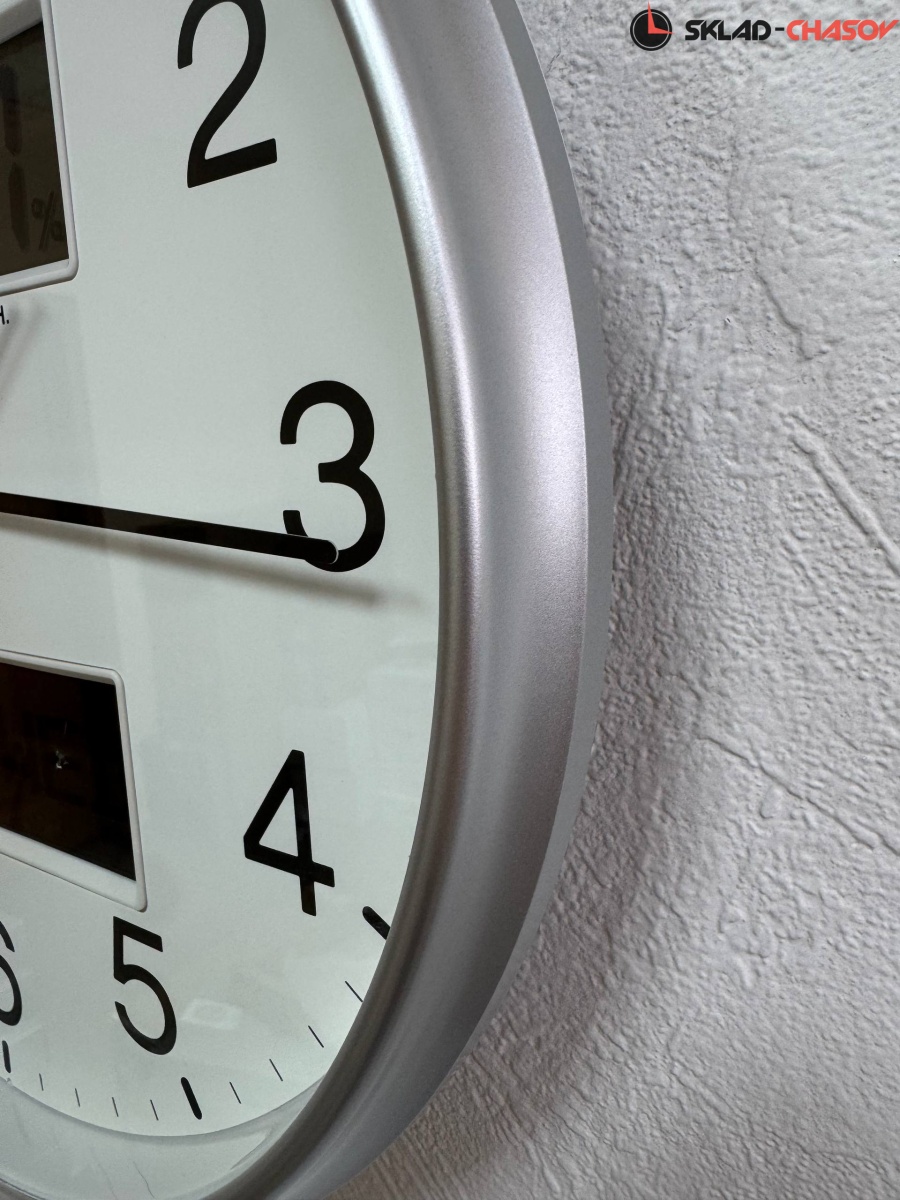 Серебристые кварцевые настенные часы с аналоговым циферблатом (стрелки). Стрелки: черная часовая, черная минутная и черная секундная. В верхней части располагается LCD-дисплей с температурой и влажностью. В нижней части - с месяцем, числом и днем недели. Корпус выполнен из пластика. Плавный ход секундной стрелки. Бесшумный механизм.
