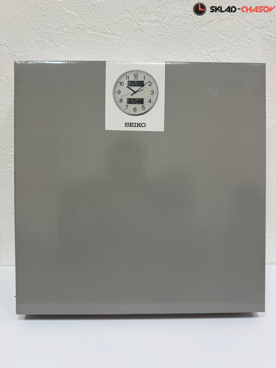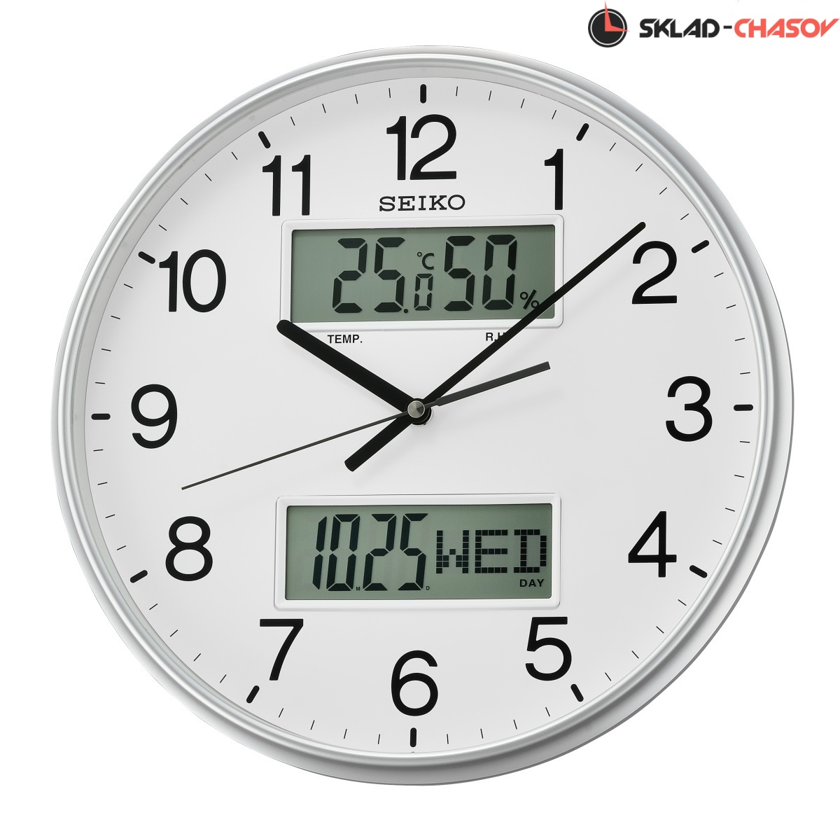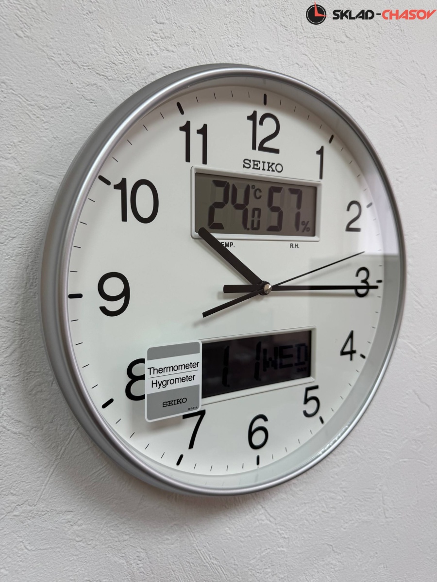 Серебристые кварцевые настенные часы с аналоговым циферблатом (стрелки). Стрелки: черная часовая, черная минутная и черная секундная. В верхней части располагается LCD-дисплей с температурой и влажностью. В нижней части - с месяцем, числом и днем недели. Корпус выполнен из пластика. Плавный ход секундной стрелки. Бесшумный механизм.