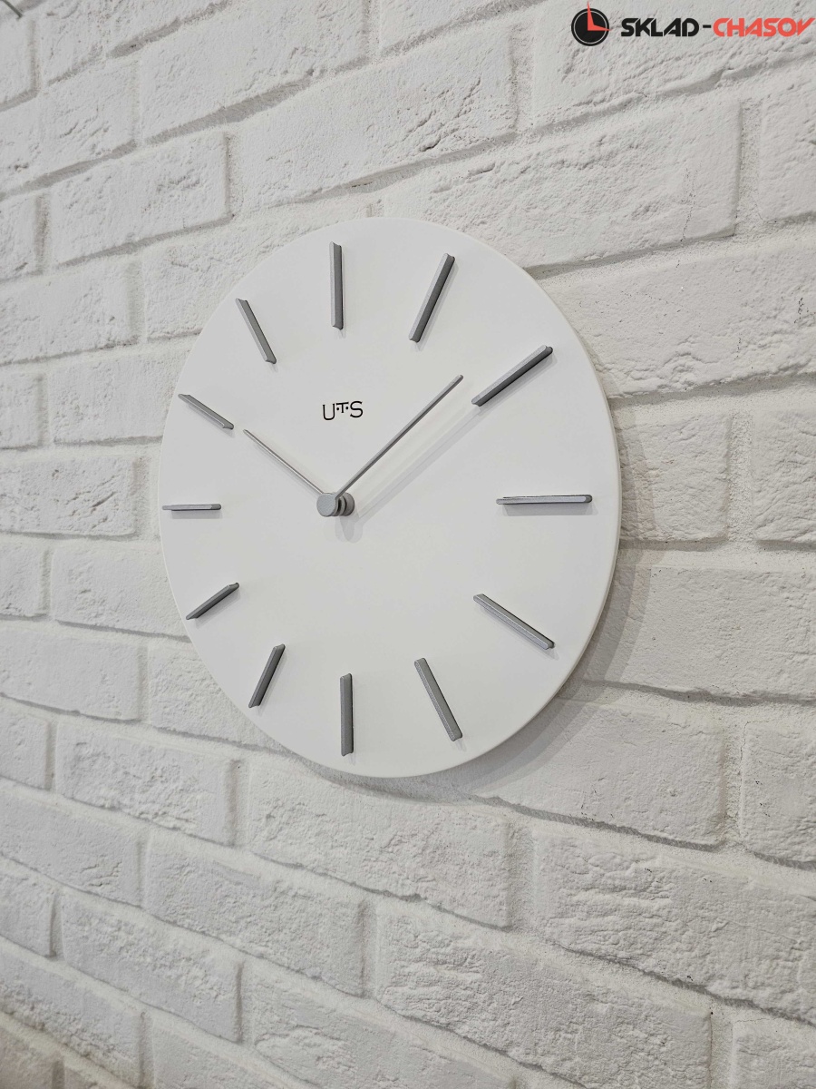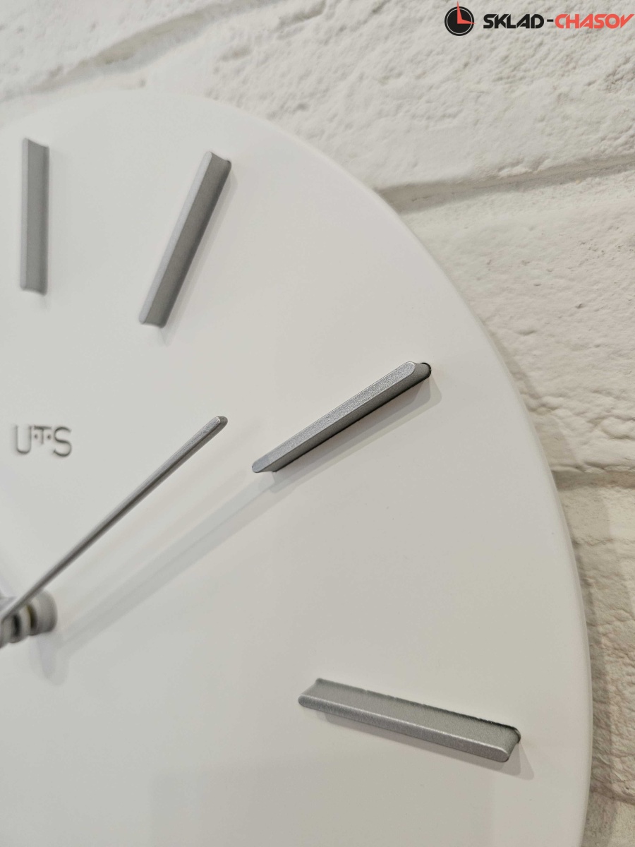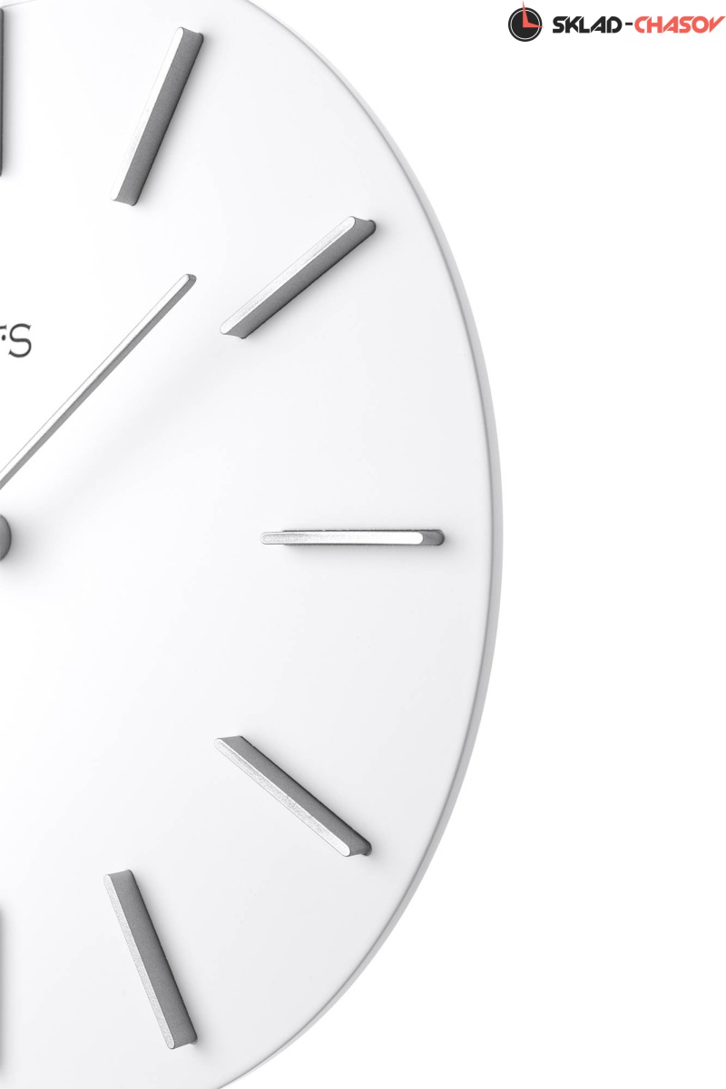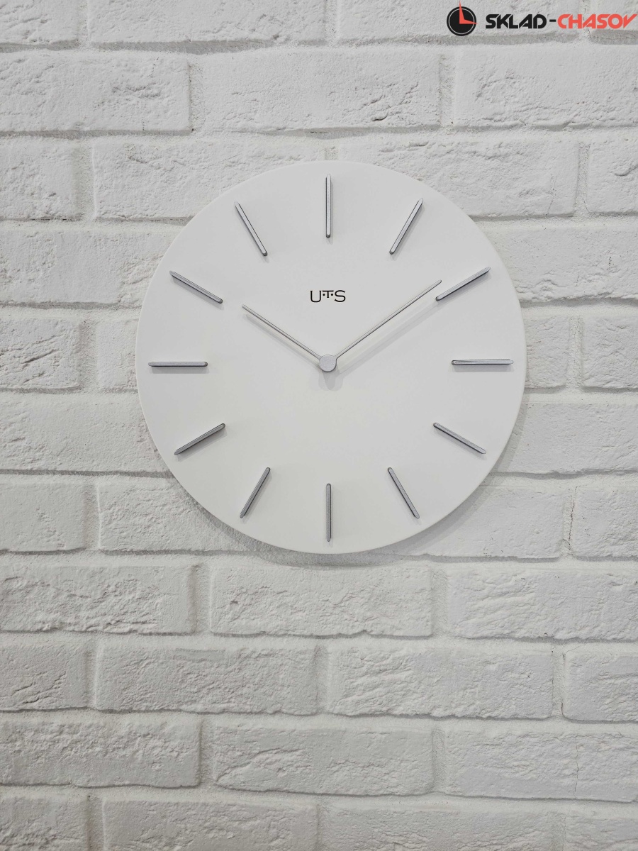 Кварцевые настенные часы с современном стиле. Корпус выполнен из МДФ и тонирован в белый цвет. Объемные часовые индексы сделаны из пластика серебряного цвета и аккуратно утоплены в специальных ложементах. В часах установлен тихий, точный и надежный механизм Young Town 12888 c дискретным ходом. Необходим 1 элемент питания типа АА (в комплект не входит).