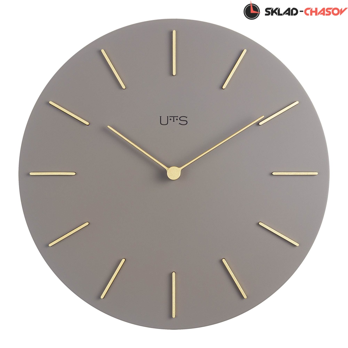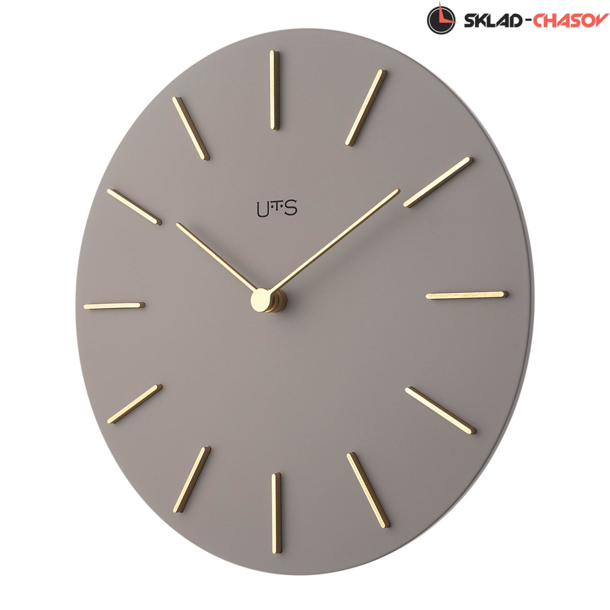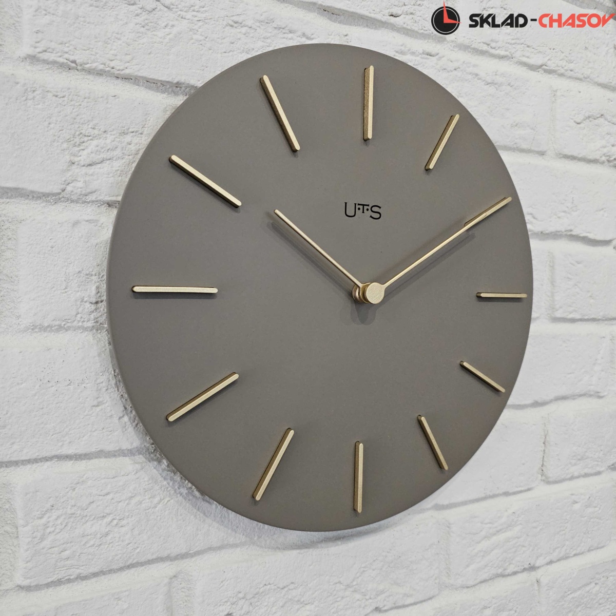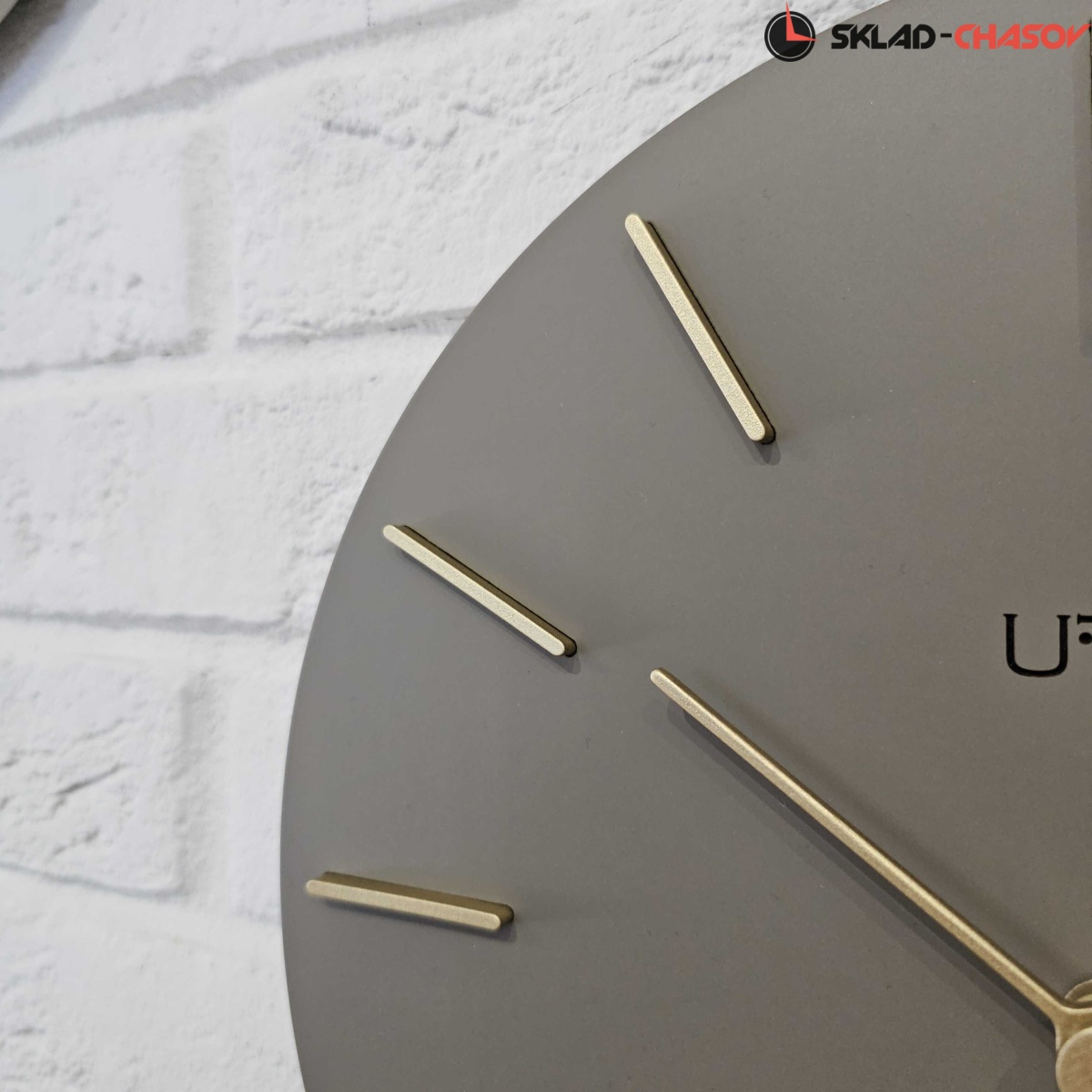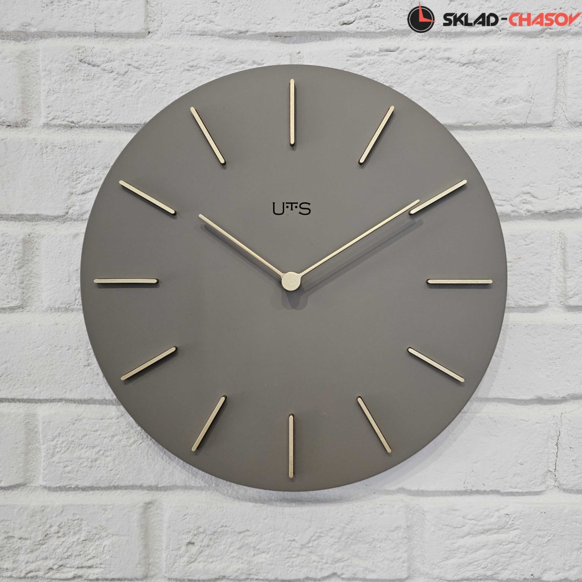 Кварцевые настенные часы с современном стиле. Корпус выполнен из МДФ и тонирован в серо-коричневый цвет. Объемные часовые индексы сделаны из пластика золотого цвета и аккуратно утоплены в специальных ложементах. В часах установлен тихий, точный и надежный механизм Young Town 12888 c дискретным ходом. Необходим 1 элемент питания типа АА (в комплект не входит).