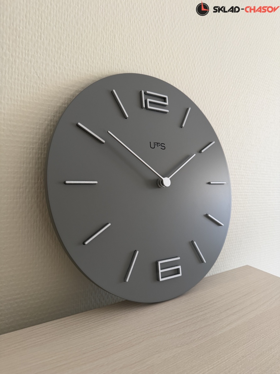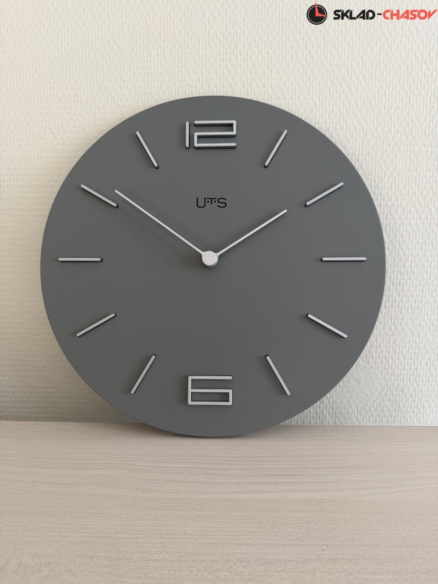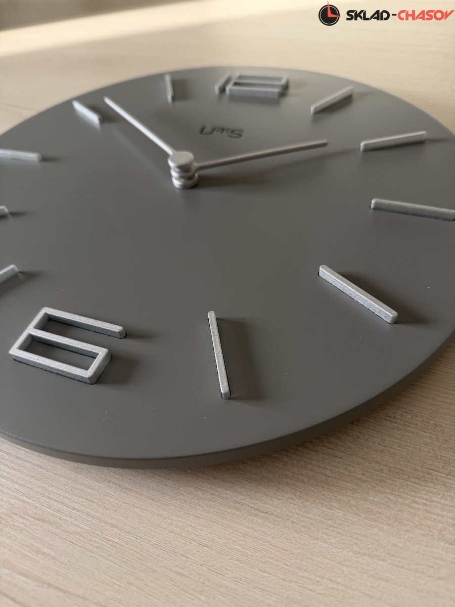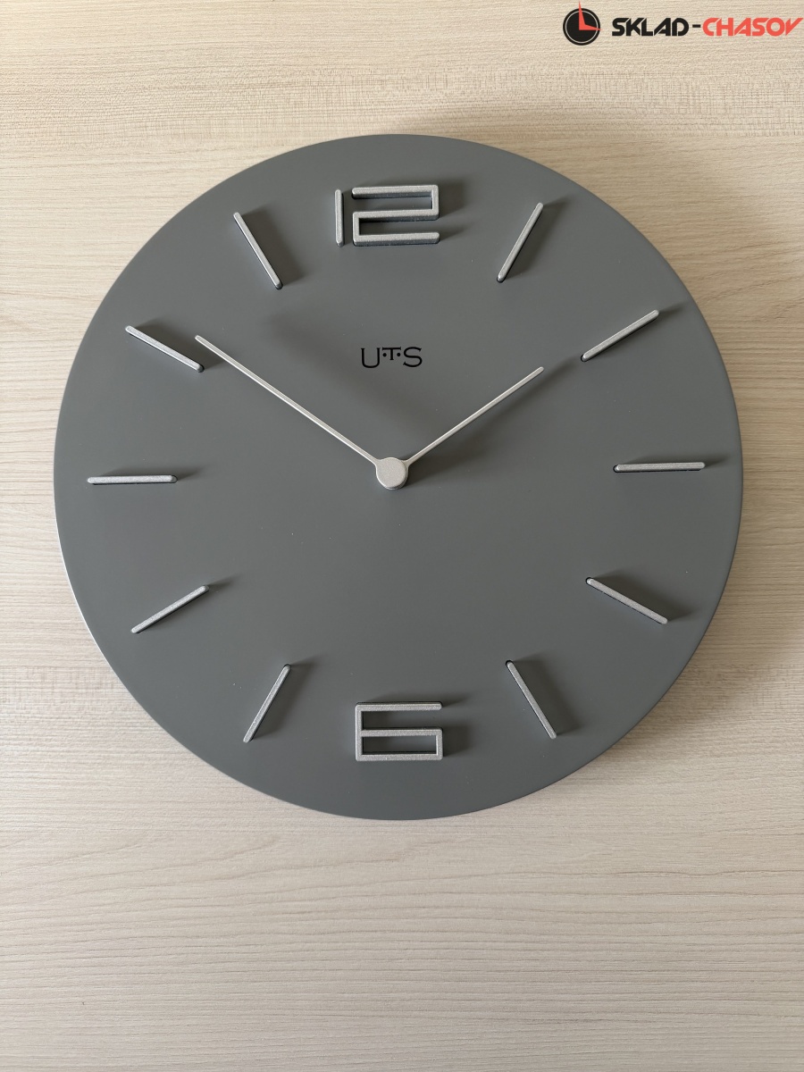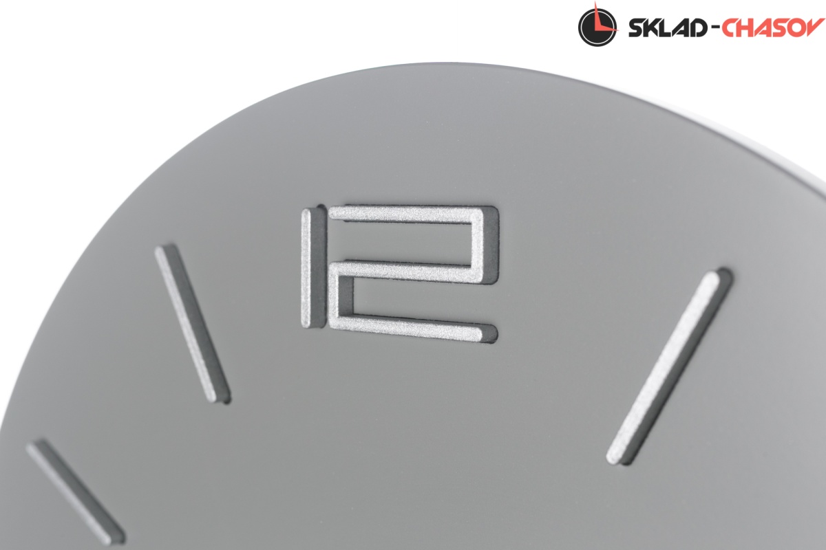 Кварцевые настенные часы с современном стиле. Корпус выполнен из МДФ и тонирован в сером цвете. Объемные часовые индексы и арабские цифры - из пластика серебряного цвета и аккуратно утоплены в специальных ложементах. В часах установлен тихий, точный и надежный механизм Young Town 12888 c дискретным ходом. Необходим 1 элемент питания типа АА (в комплект не входит).