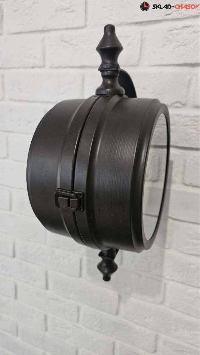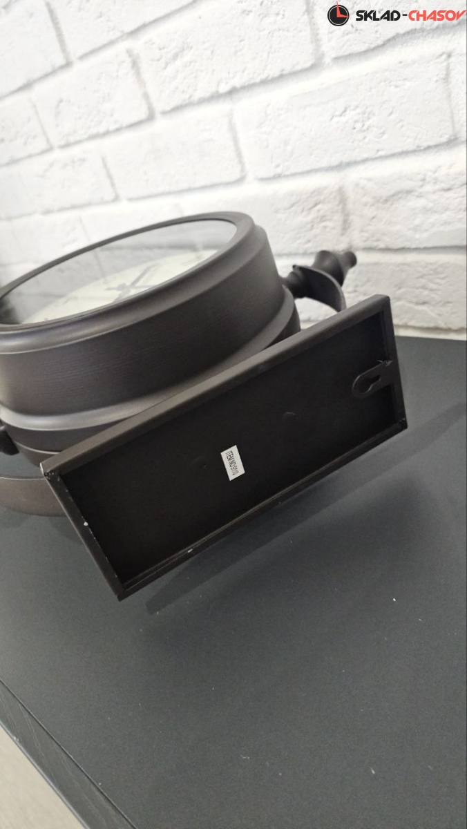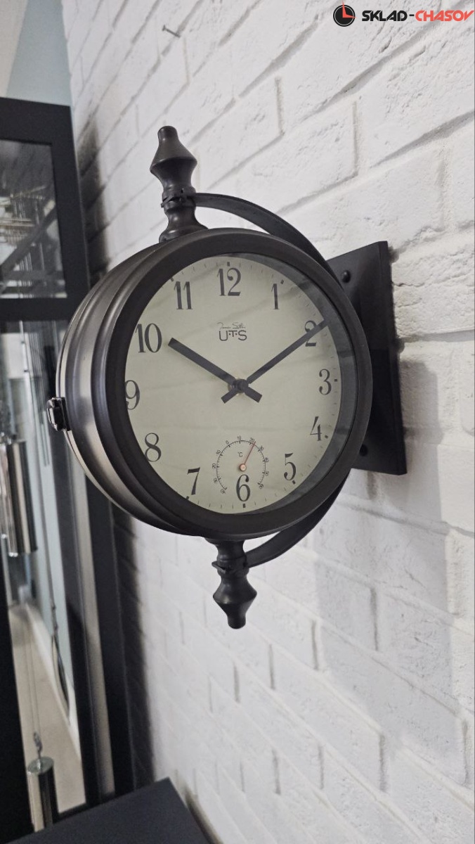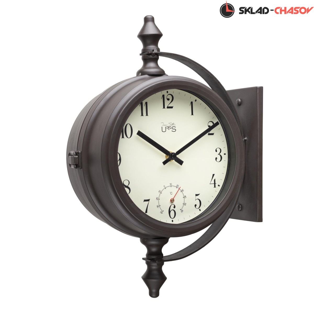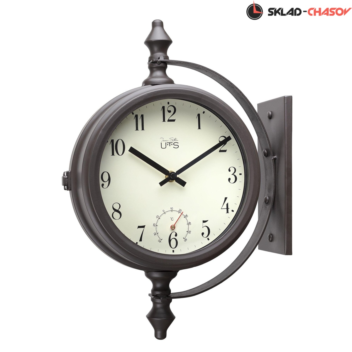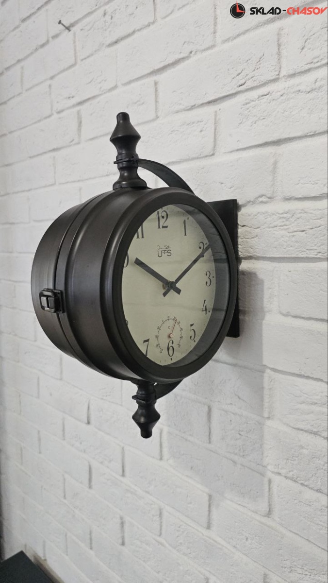 Кварцевые настенные часы с двусторонним циферблатом и отдельно вынесенным термометром.