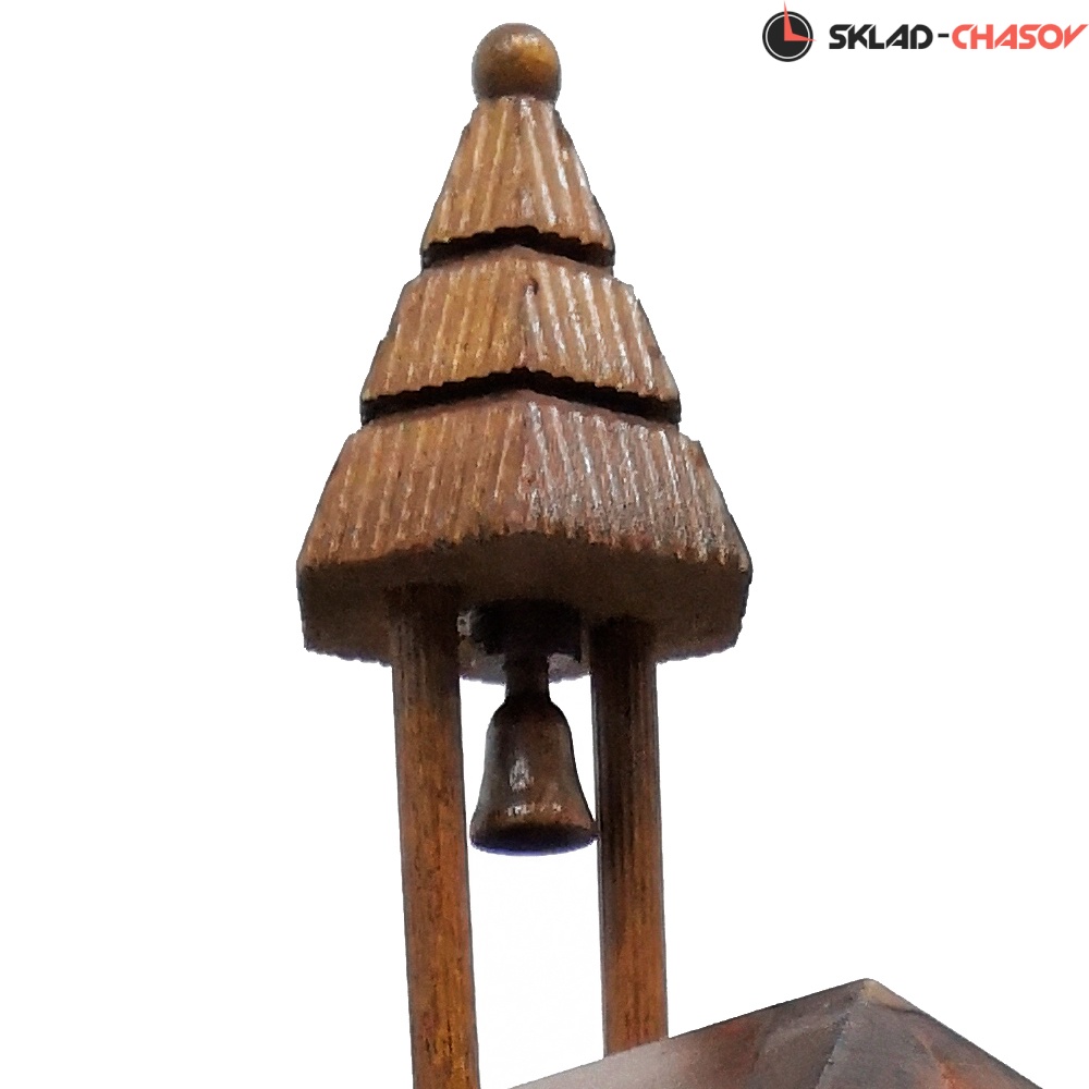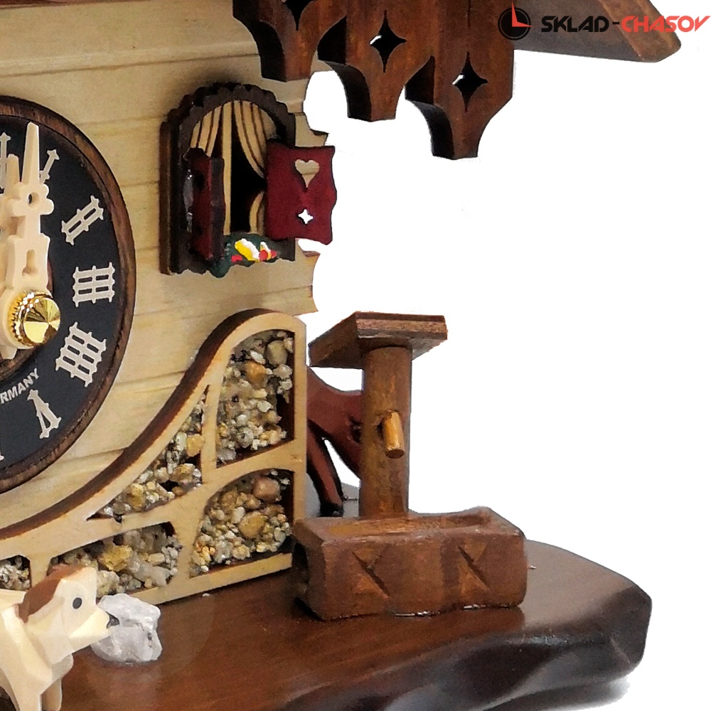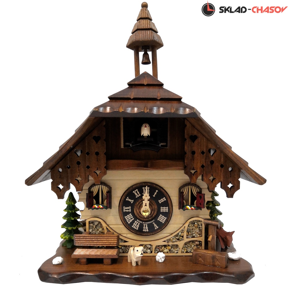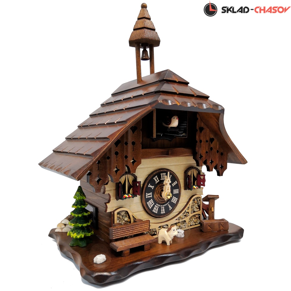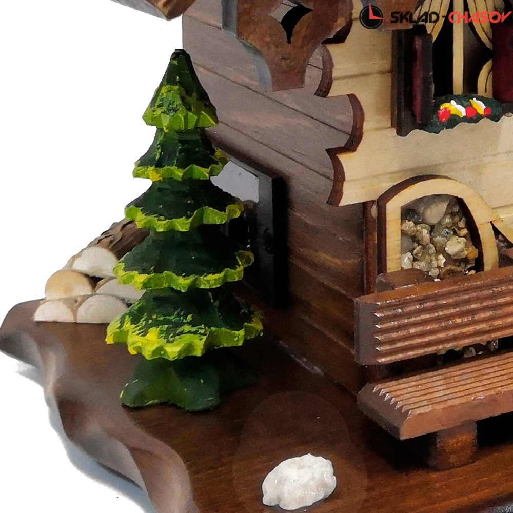 - Корпус выполнен из натурального дерева, собран очень качественно опытными мастерами своего дела, декорирован резными элементами тонкой ручной работы и украшен ручной росписью. Можно повесить как на стену, так и поставить на стол. Модель в виде шварцвальдского домика елочкой, скамейкой и водяной колонкой перед домом.- Кукушка срабатывает каждый полный час, кукует по количеству часов и каждый час проигрывает мелодия. Всего 12 мелодий.