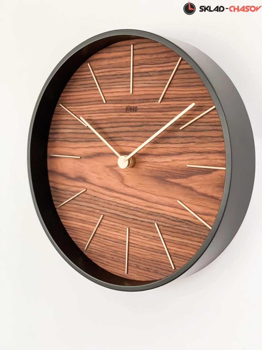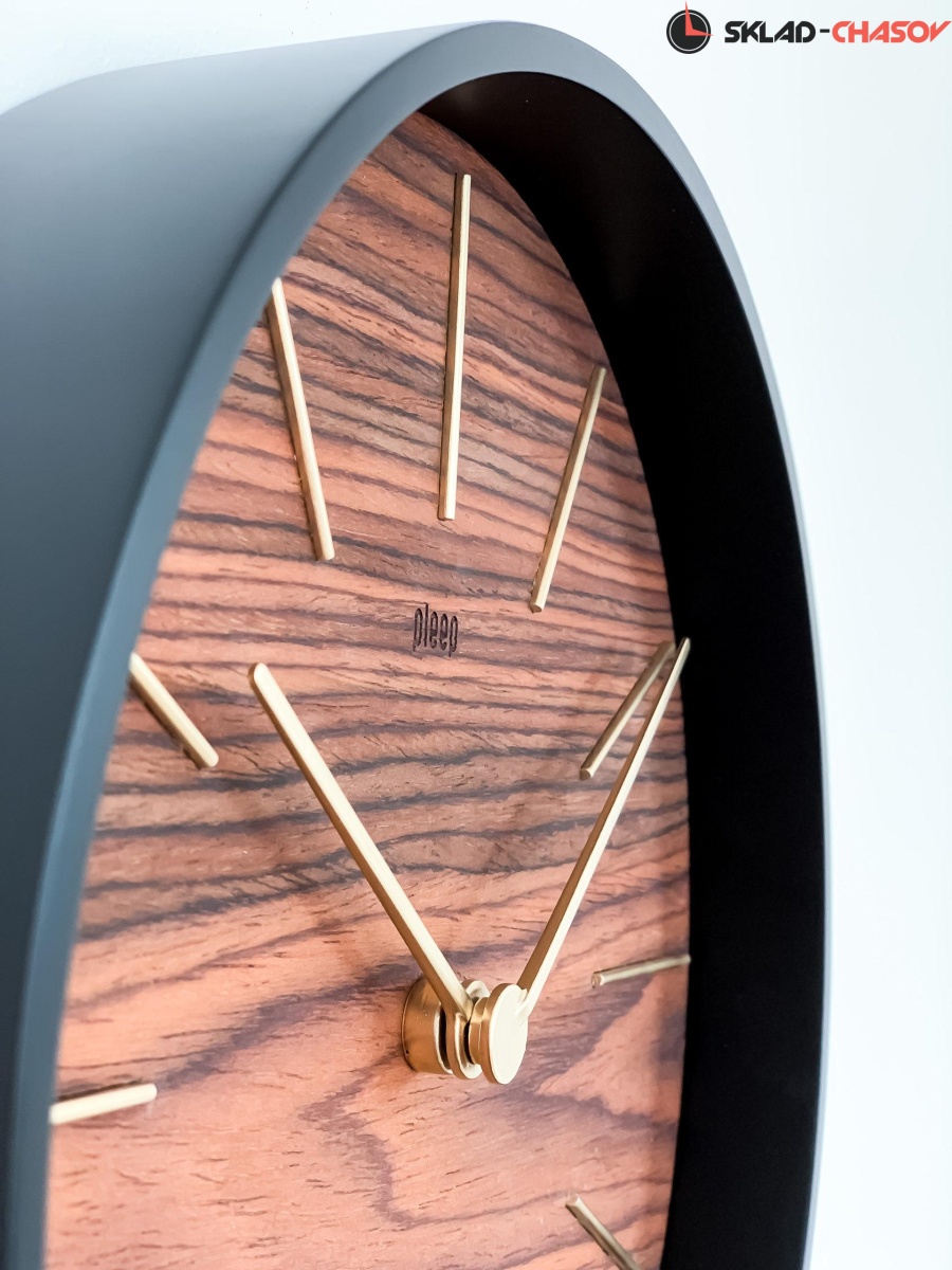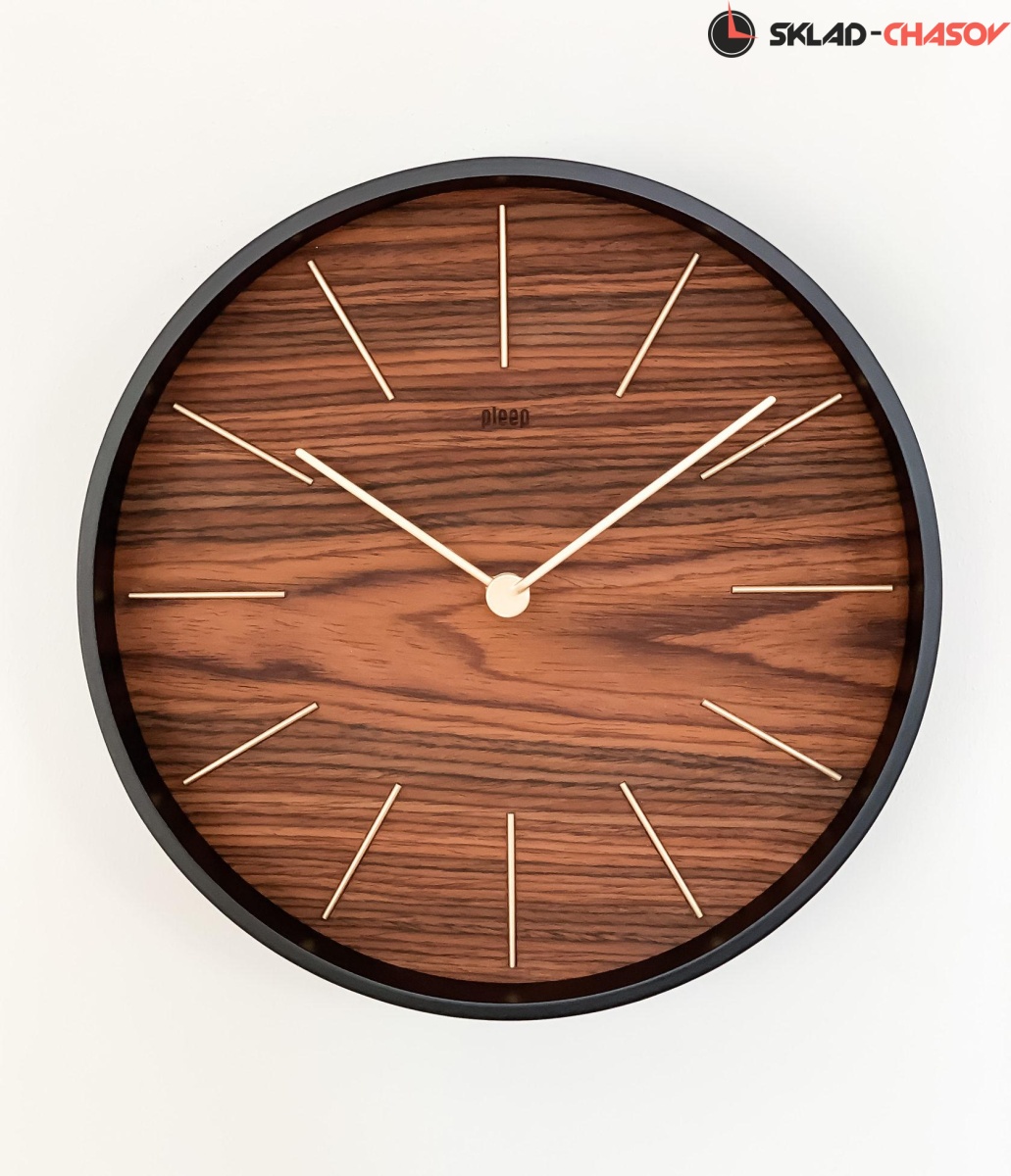 Черный обод, циферблат выполнен из шпона полисандра, стрелки и декор из пластика в золотом цвете.