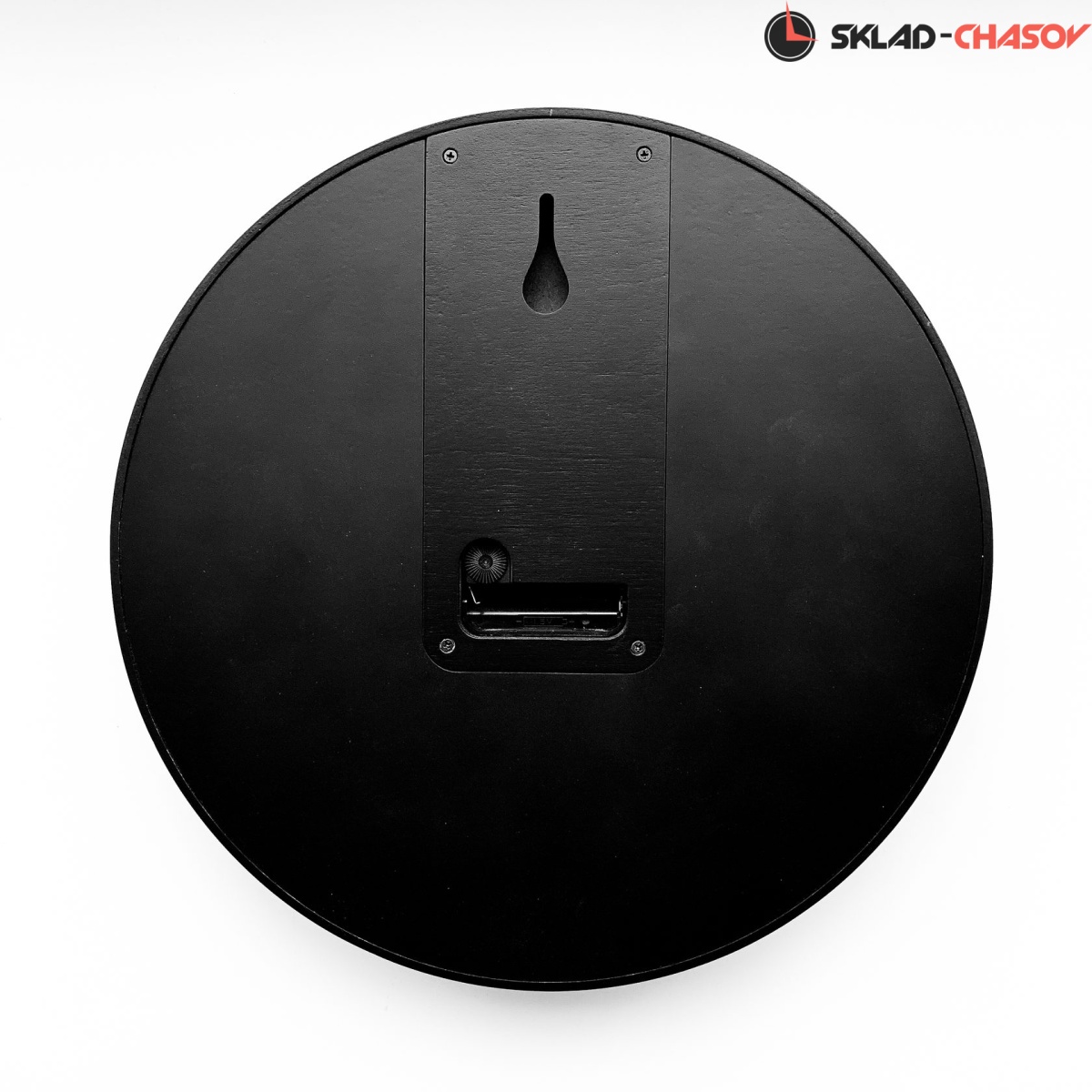 Черный обод, циферблат выполнен из шпона полисандра, стрелки и декор из пластика в черном цвете.