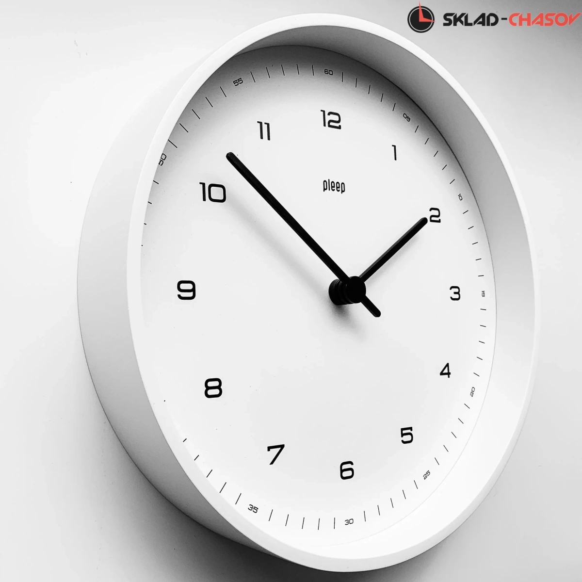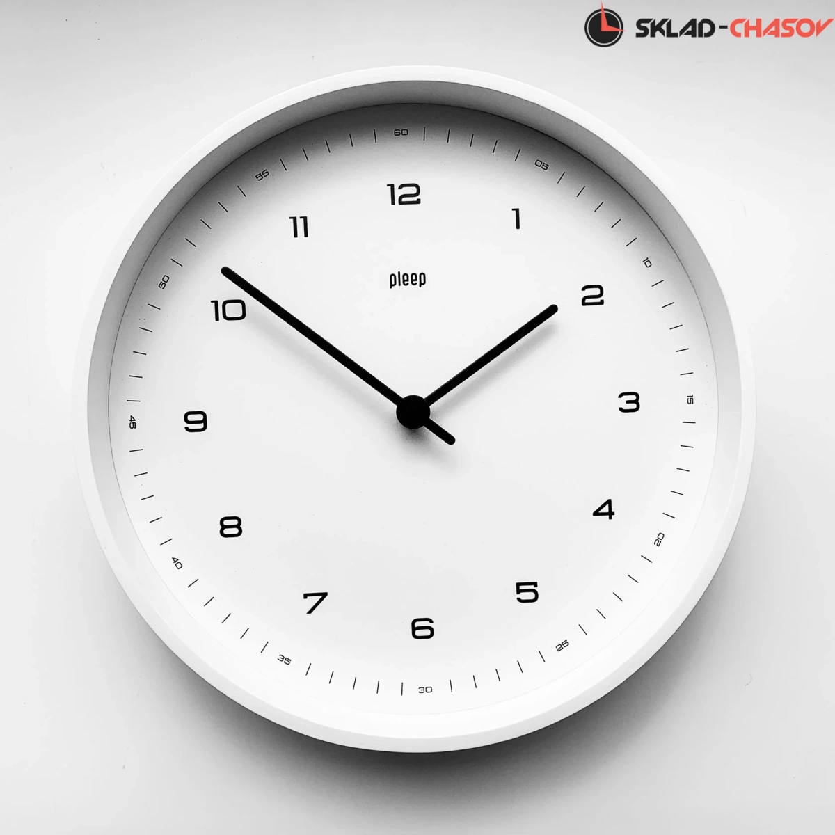 Белый обод, белый циферблат с черными цифрами.