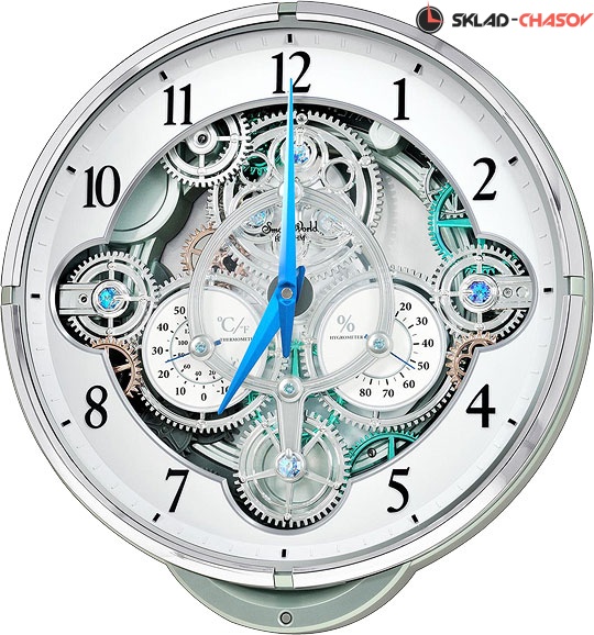 Новинка! Часы настенные серии MAGIC MOTION.Циферблат с мраморным принтом и ежечасовое волшебное вращение шестеренок.CTS звучание(12+12классических+6 рождественских мелодий).Термометр, Гигрометр. Почасовая мелодия. Режим демонстрации. Автоматический выключатель мелодии в темноте с сенсорным датчиком.Художественное оформление циферблата кристаллом Swarovski. Регулятор громкости. Размер 39х41х8,6см. Вес 2,4 кг. Корпус - пластик. Цвет: зеленоватый оттенок. Батареи Dх2 шт. (входят в комплект).