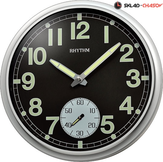 Часы настенные. Вынесенная секундная стрелка. Цвет корпуса - серый, циферблат - черный. Материал - пластик. Элемент питания - ААх2 (входит в комплект).