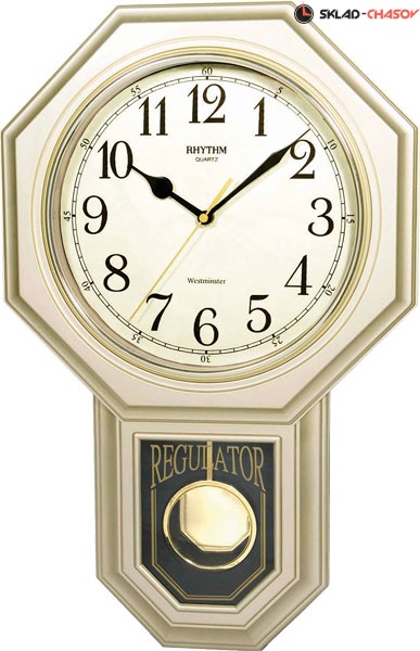 Часы настенные музыкальные с маятником. Глушитель мелодии в ночное время. Регулятор громкости. 1 мелодия Westminster + striking. Батареи AAх4шт. (входят в комплект). Габариты 30х47,5х7см. Вес 1,2кг. Материал: пластик. Цвет: золотой. 5шт./кор.