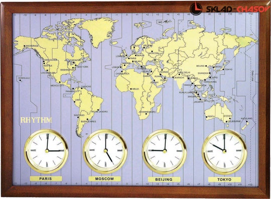 Часы настенные. Карта. 4 отдельно настраиваемых циферблата. В комплекте: 37 пластин с названиями крупных городов мира+3 чистые пластины. . Цвет - коричневый. Материал - дерево. Элемент питания - ААх4 (входят в комплект)