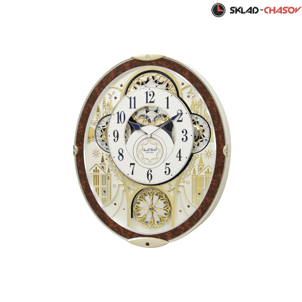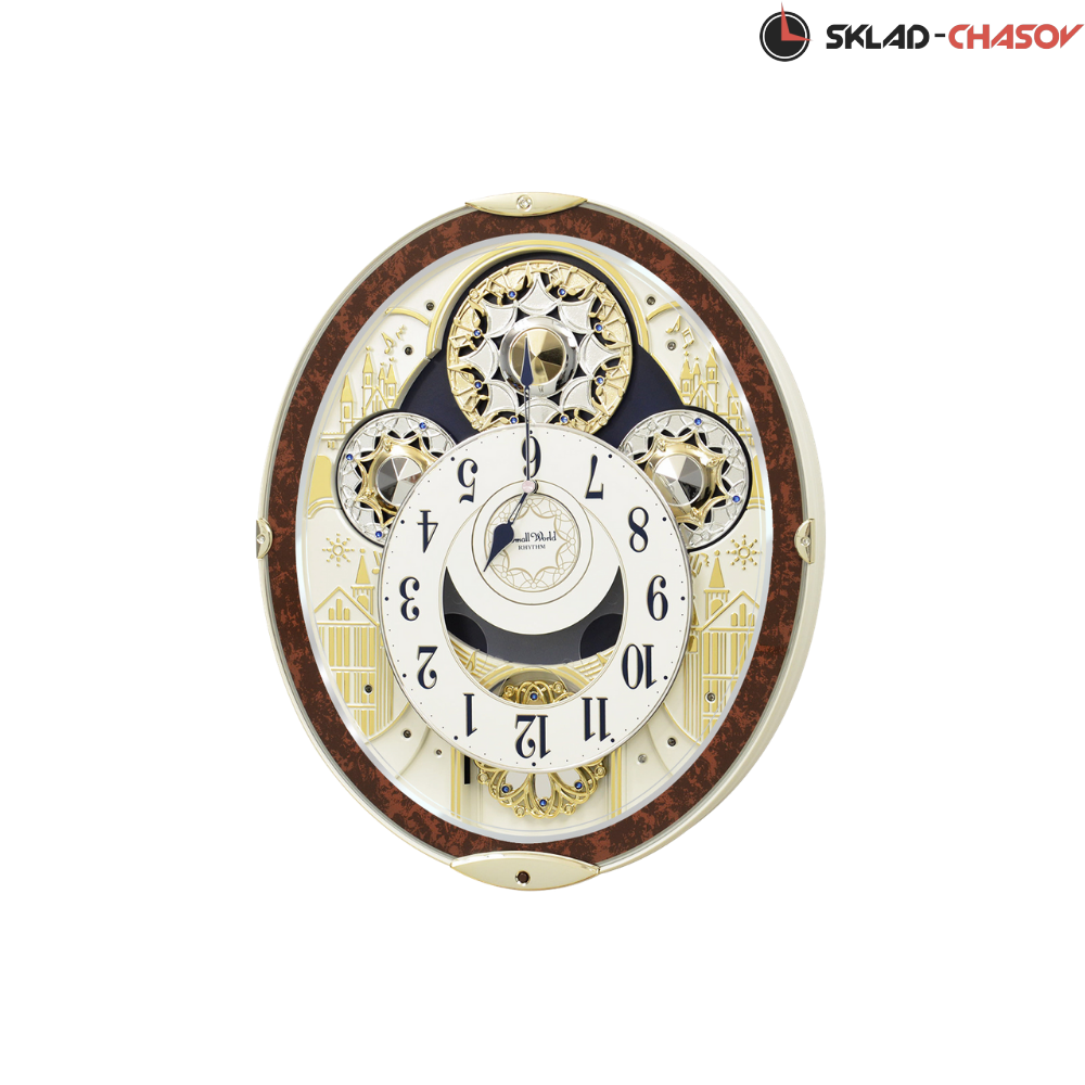 Новинка 2021г. Часы настенные музыкальные Gala III. Почасовая мелодия. Во время звучания мелодии циферблат поворачивается, опускаясь вниз и демонстрируя 3 декоративных элемента, которые вращаются в соответствии с одной из 30 мелодий CTS-звучания (12+12 мелодий и 6 рождественских мелодий). Постоянно вращающийся маятник украшен голубыми кристаллами и зеркалами. Автоматический выключатель мелодии в ночное время суток с сенсорным датчиком. Демо-кнопка. Выключатель музыкального сопровождения. Регулятор звука. Материал - пластик. Печать рамки под дерево на стекле. Батареи Dх2шт. (входят в комплект). Габариты 37,5 х 45,5 х 8,5 см. Вес 2,51кг.