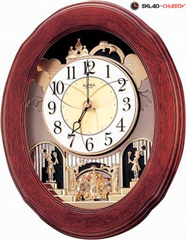 Настенные часы с маятником. В конце каждого часа под музыку циферблат вращается и раскладывается на три части. Регулятор громкости звука. Автоматическое отключение мелодии на ночь.