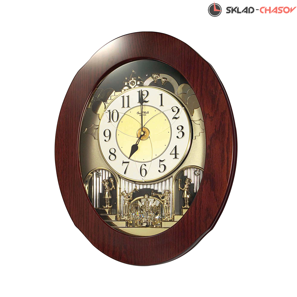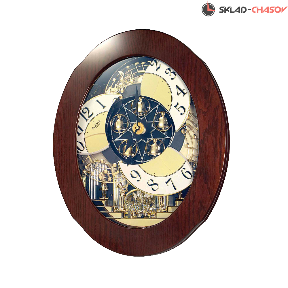 Часы настенные музыкальные из серии NOSTALGIA. Почасовая мелодия. На часах циферблат разъезжается и делится на три части, открывая пять золотых колокольчиков, в это время играет одна из известных CTS мелодий (12+12 классических + 6 рождественских мелодии). Красивая рамка из вишневого дерева вместе с кристаллами Swarovski на маятнике-вертушки и золотыми вставками делают эти часы поистине элегантным дополнением любого дома. Функция демонстрации. Автоматический глушитель мелодии в ночное время суток с сенсорным датчиком. Регулятор звука. Материал - натуральное дерево. Габариты 41,5 х 52,4 х 11,6см. Вес 4,9кг. Батареи D x 2 (входят в комплект).
