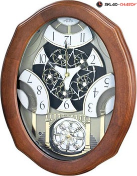 Настенные часы с маятником. Регулировка громкости. Автоматическое выключение мелодии. В конце каждого часа, в сопровождении мелодии, циферблат раскладывается на три вращающиеся части. 30 мелодий.
