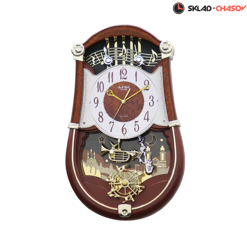 Настенные кварцевые японские часы Rhythm 4MH889WU23. Часы настенные Concerto Entertainer II. Каждый час механизм приводит в движение маленьких музыкантов, которые вращаются и раскачивается маятник с трубой и саксофоном. Светодиоды синхронизируются с музыкой. 30 мелодий CTS звучание (12+12классических+6 рождественских мелодий). Режим демонстрации. Автоматический выключатель мелодии в темноте с сенсорным датчиком. Регулятор громкости. Размер 30х49х10,5 см. Корпус: пластик. Цвет: коричневый.