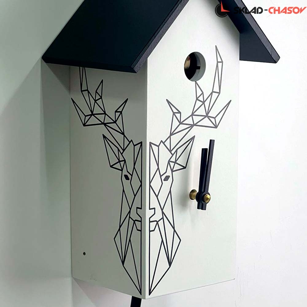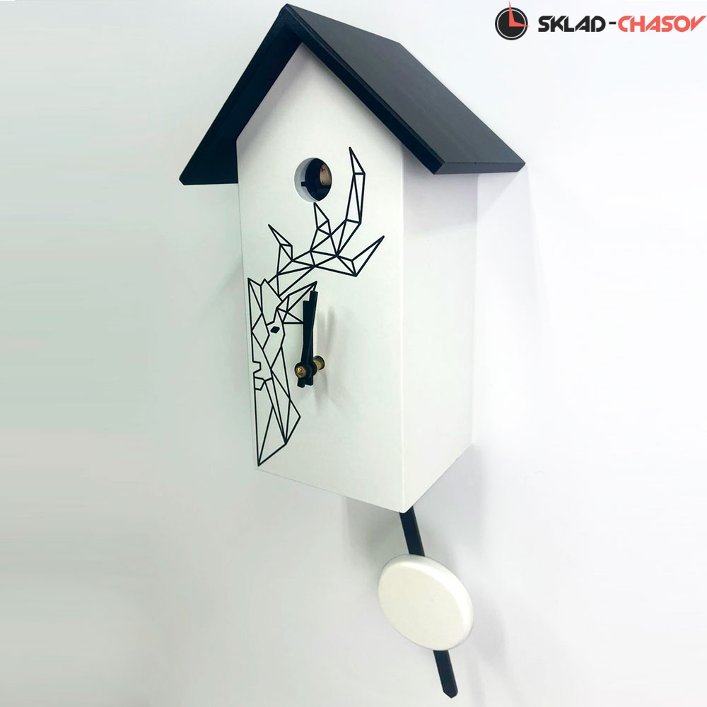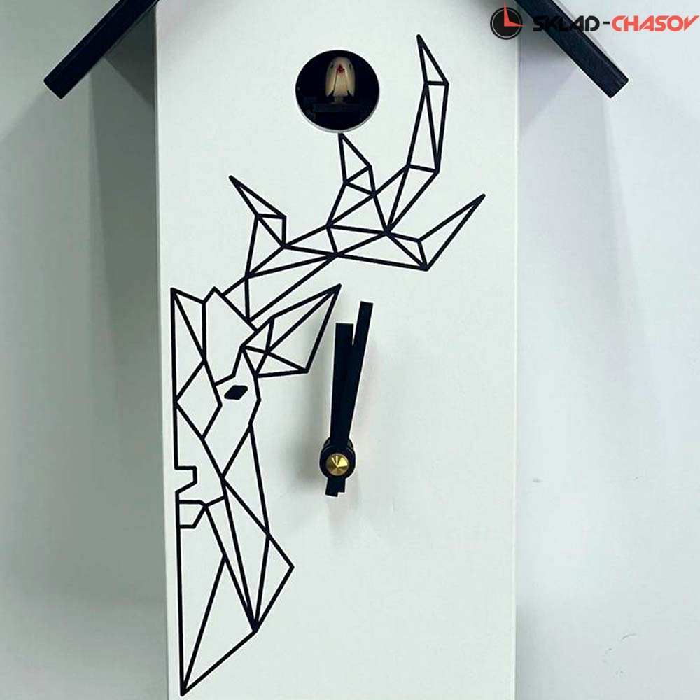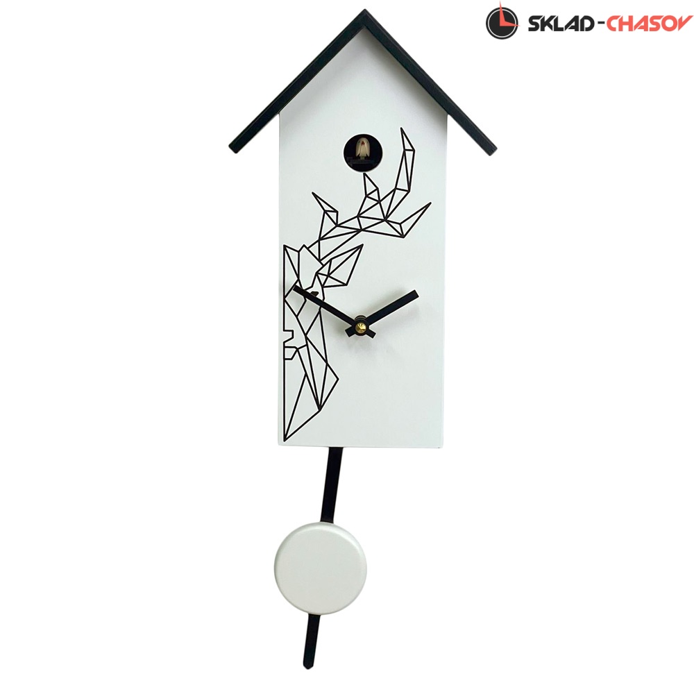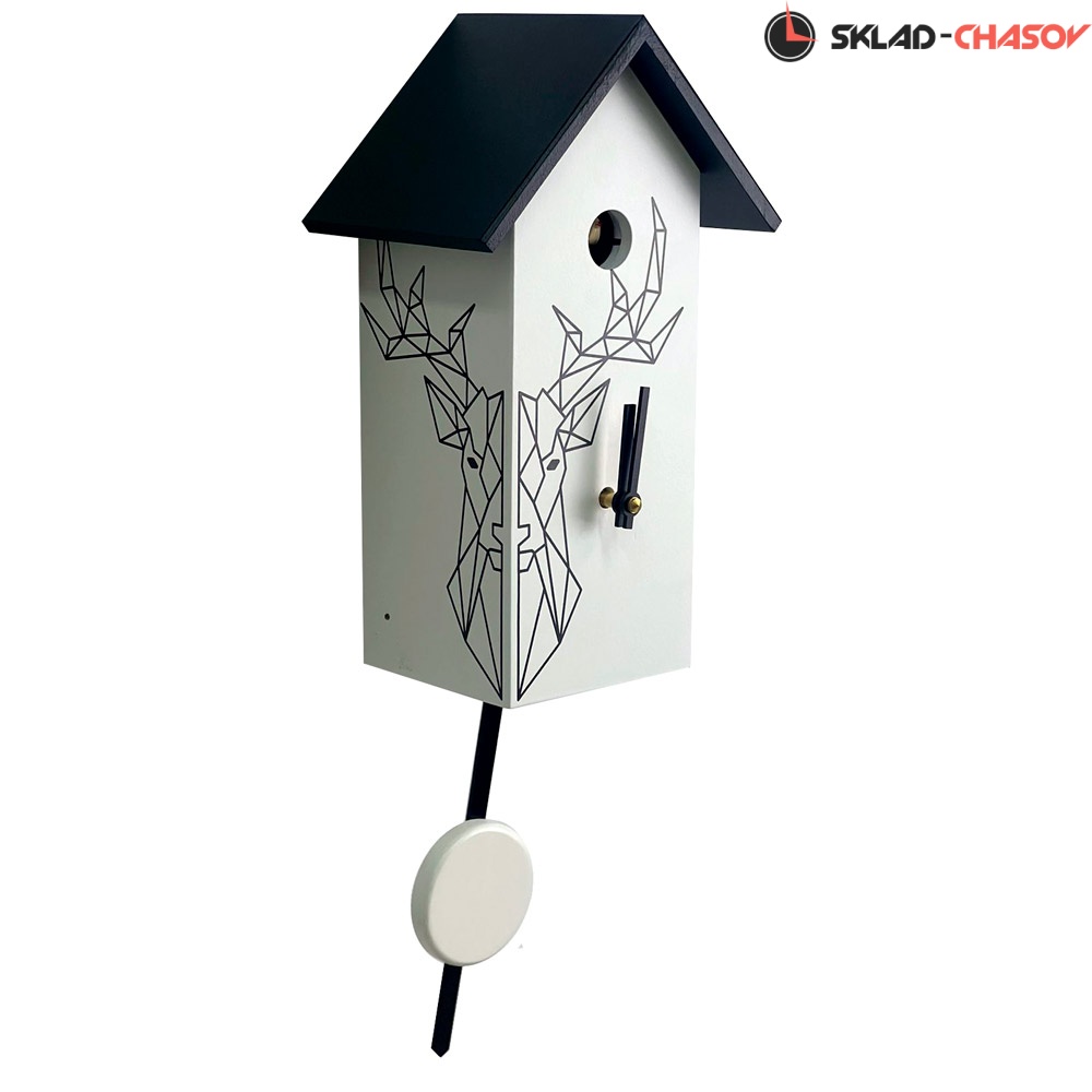 Часы шварцвальдские с кукушкой SARS 0360/32-8 (Германия) на батарейках имеют надежный немецкий механизм и безупречное качество сборки и производства. Фасад в виде скворечника сделан в современном стиле белого цвета с изображением черного оленя.