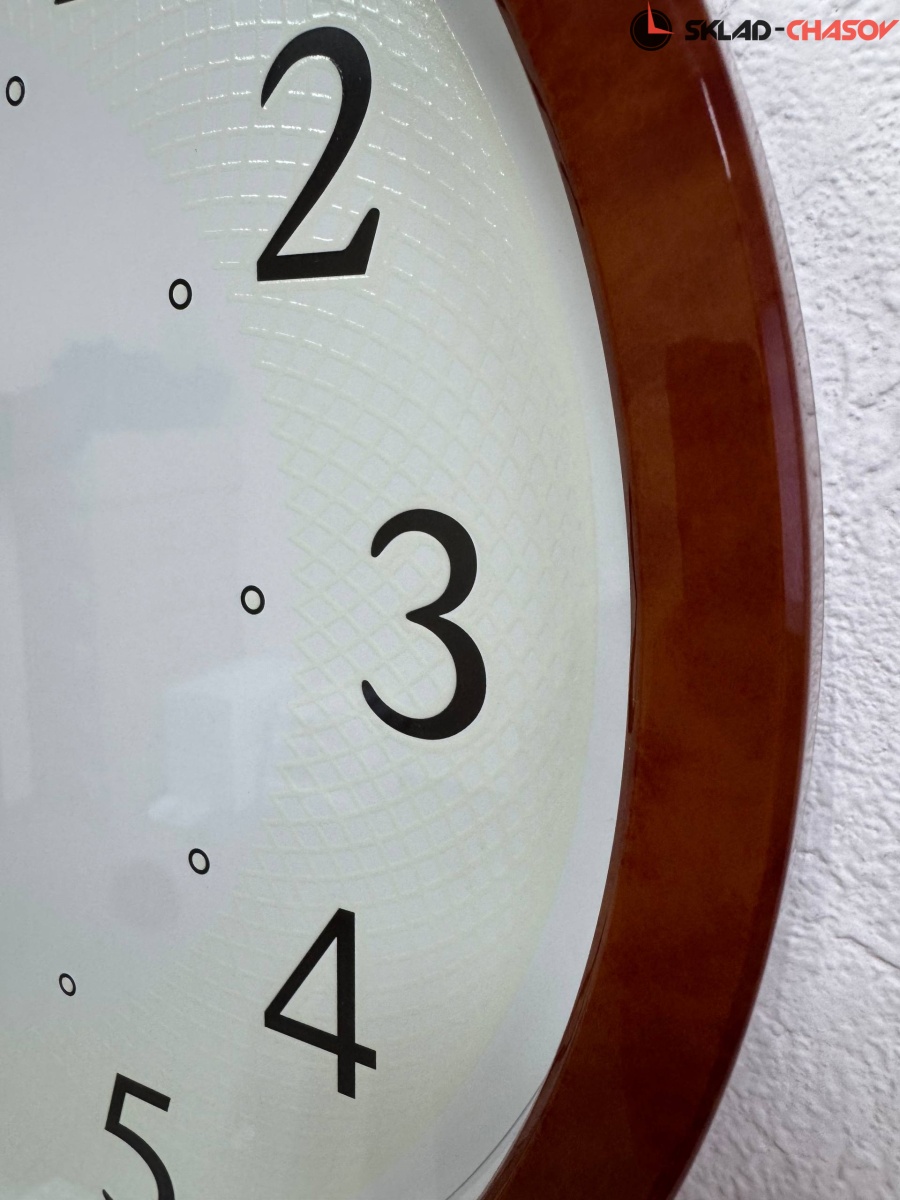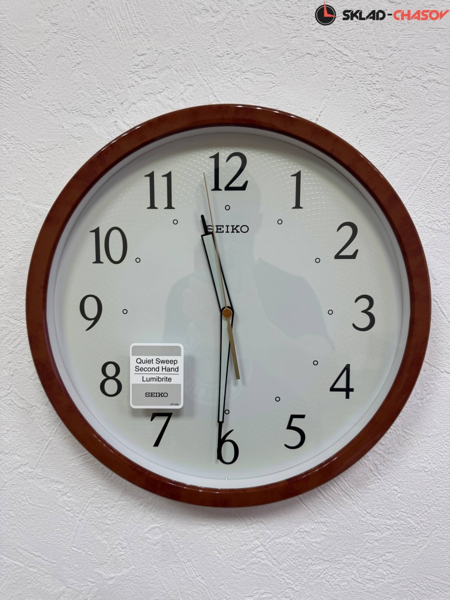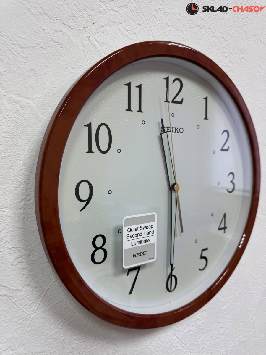 Кварцевые настенные часы Seiko в круглом коричневом корпусе с аналоговым циферблатом (стрелки). Корпус выполнен из пластика. Стрелки: черная часовая, черная минутная с нанесением люминесцентного покрытия и золотистая секундная. Циферблат с люминесцентной подсветкой LumiBrite, что позволит видеть время в темное время суток. Бесшумное и плавное движение секундной стрелки.
