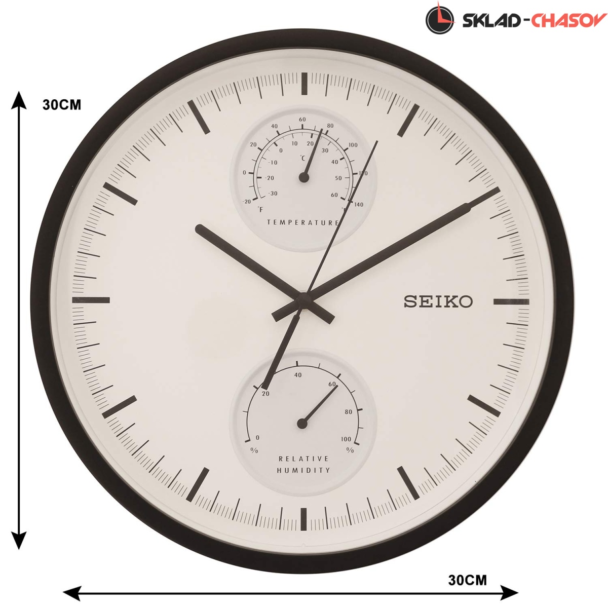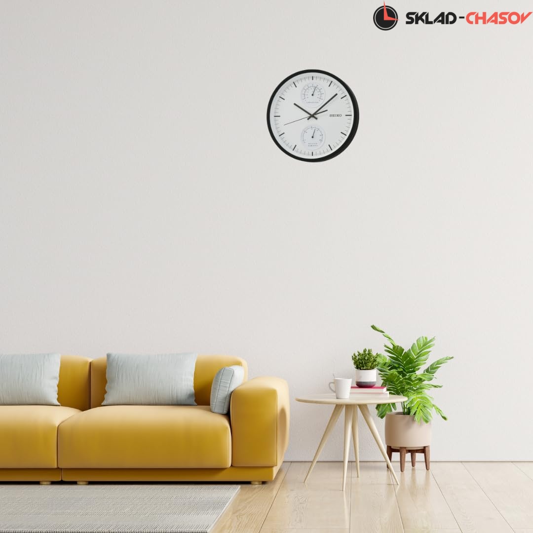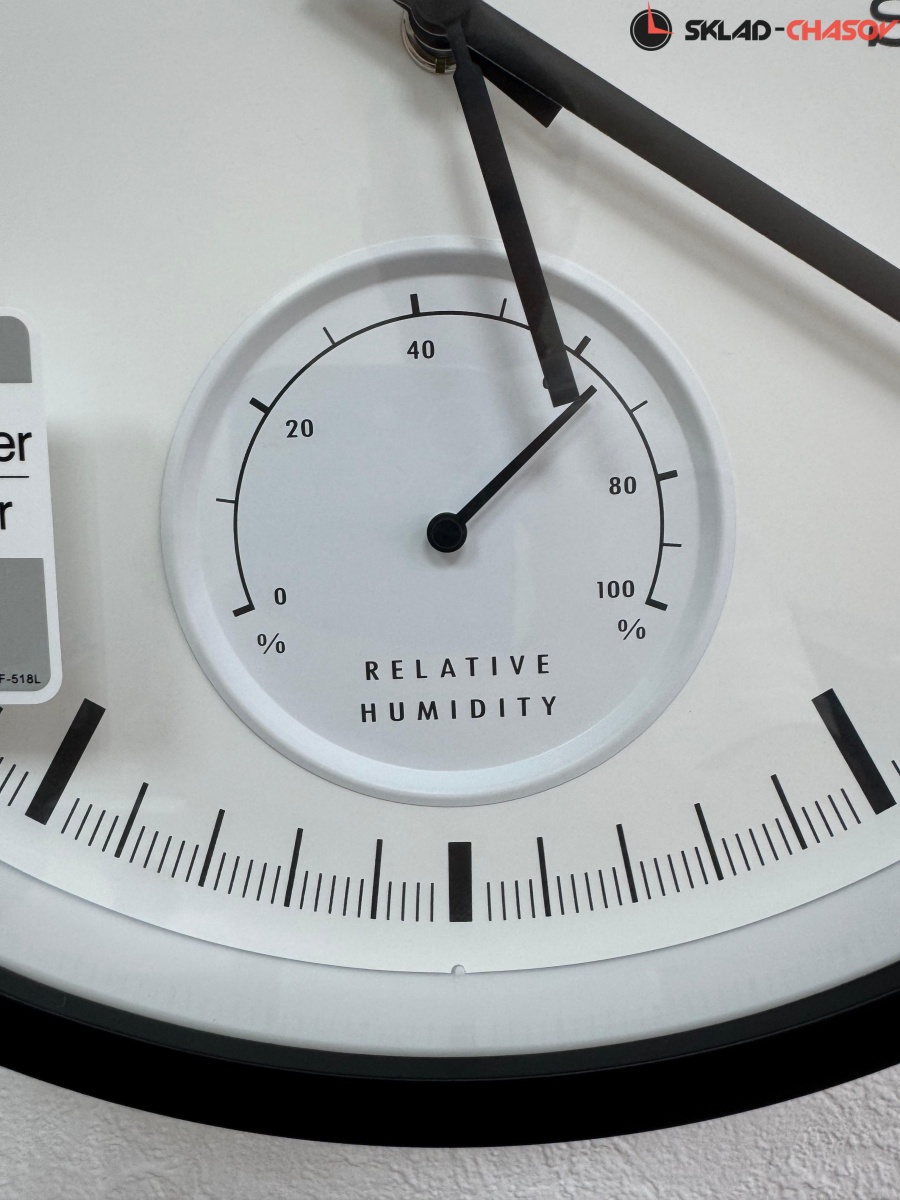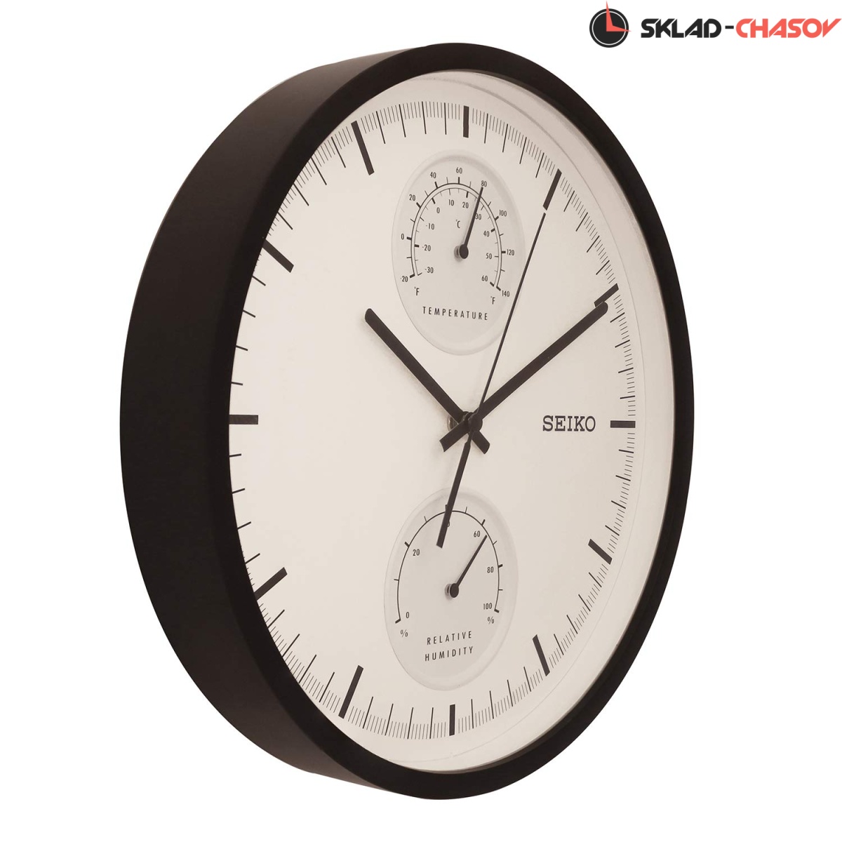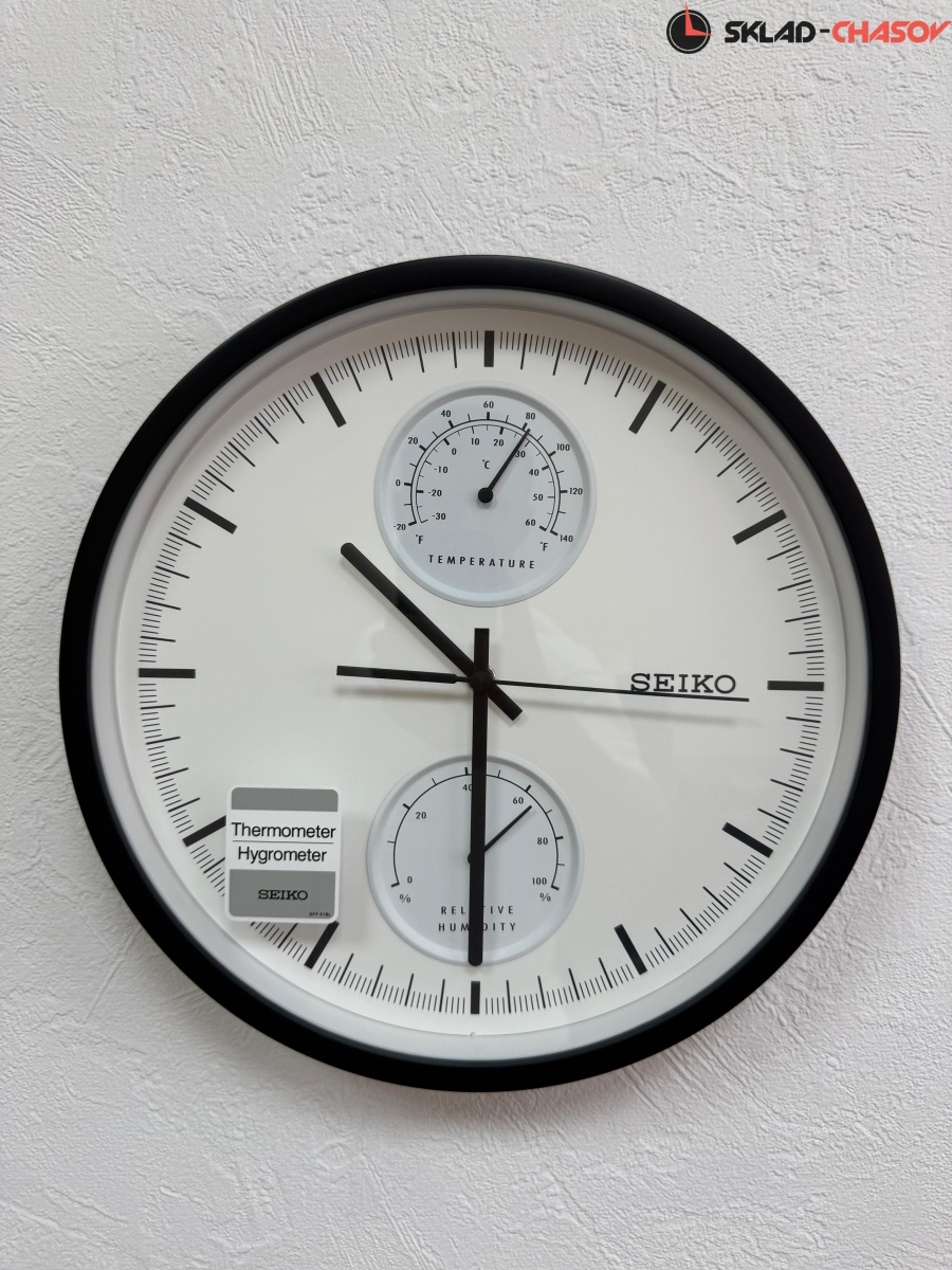 Черные кварцевые настенные часы с аналоговым циферблатом (стрелки). Стрелки: черная часовая, черная минутная и черная секундная. Часы определяют температуру и влажность воздуха в помещении, показания выносятся на циферблат. Пластиковый корпус.