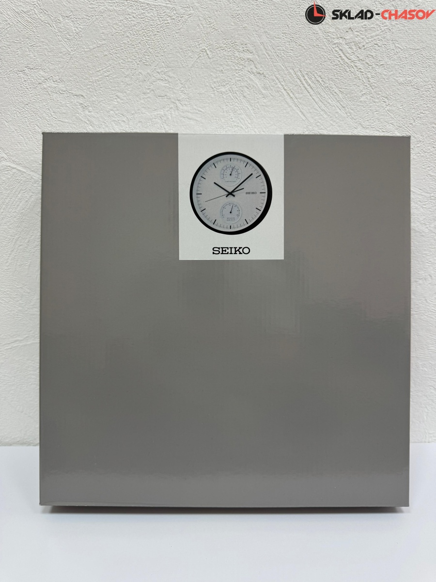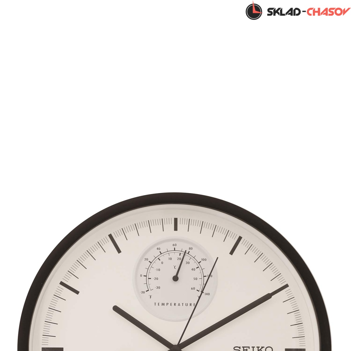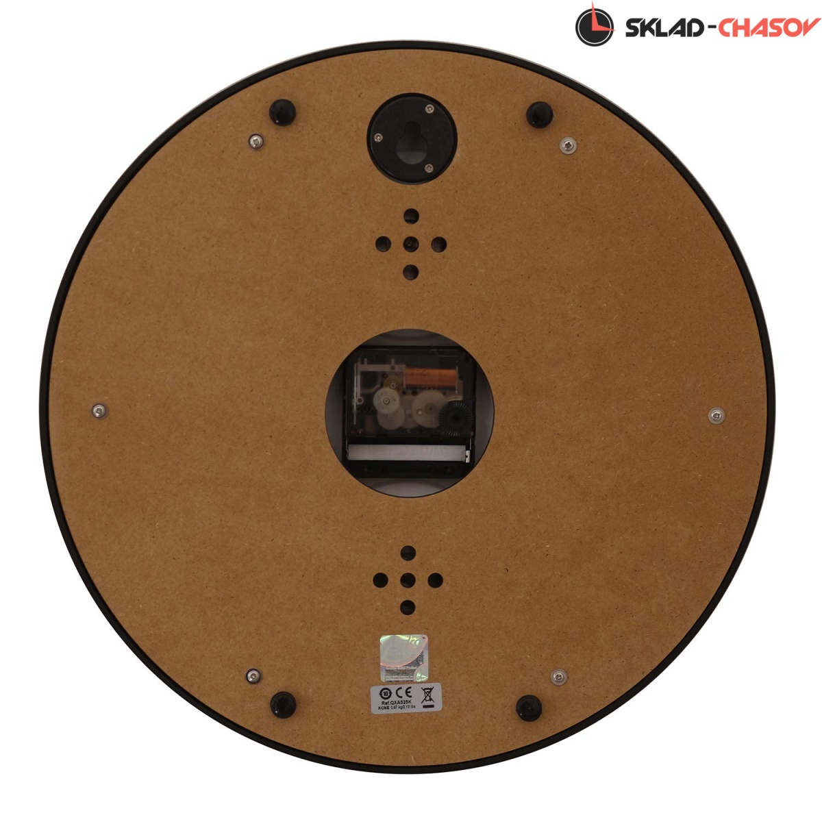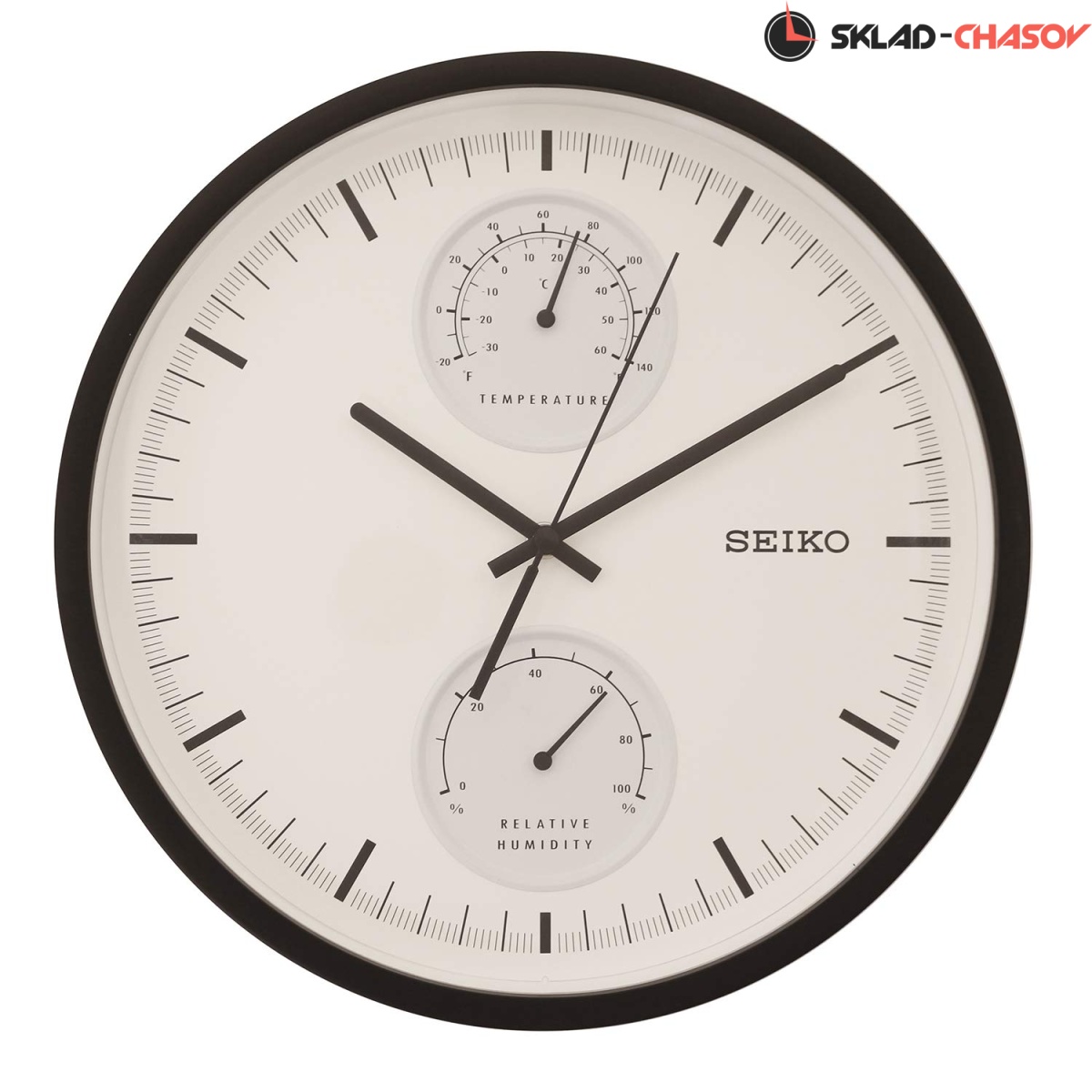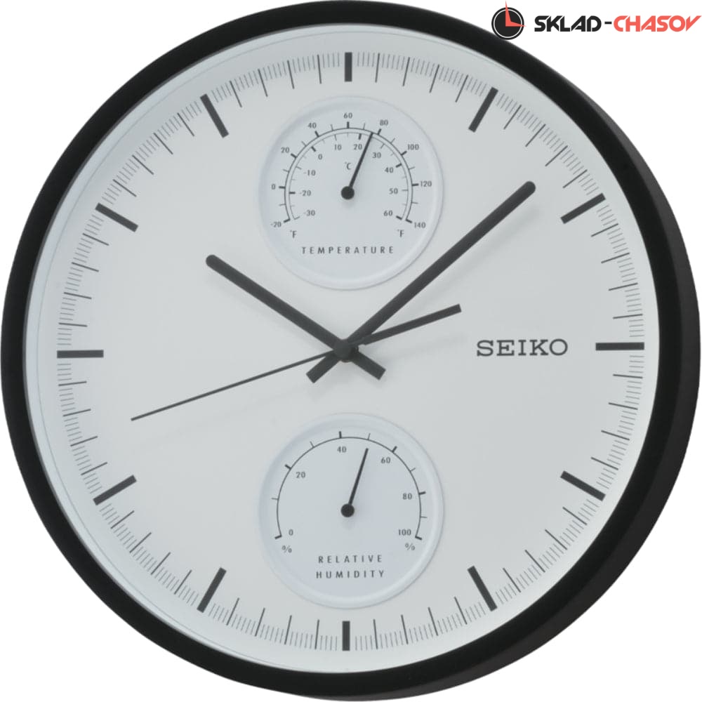 Черные кварцевые настенные часы с аналоговым циферблатом (стрелки). Стрелки: черная часовая, черная минутная и черная секундная. Часы определяют температуру и влажность воздуха в помещении, показания выносятся на циферблат. Пластиковый корпус.