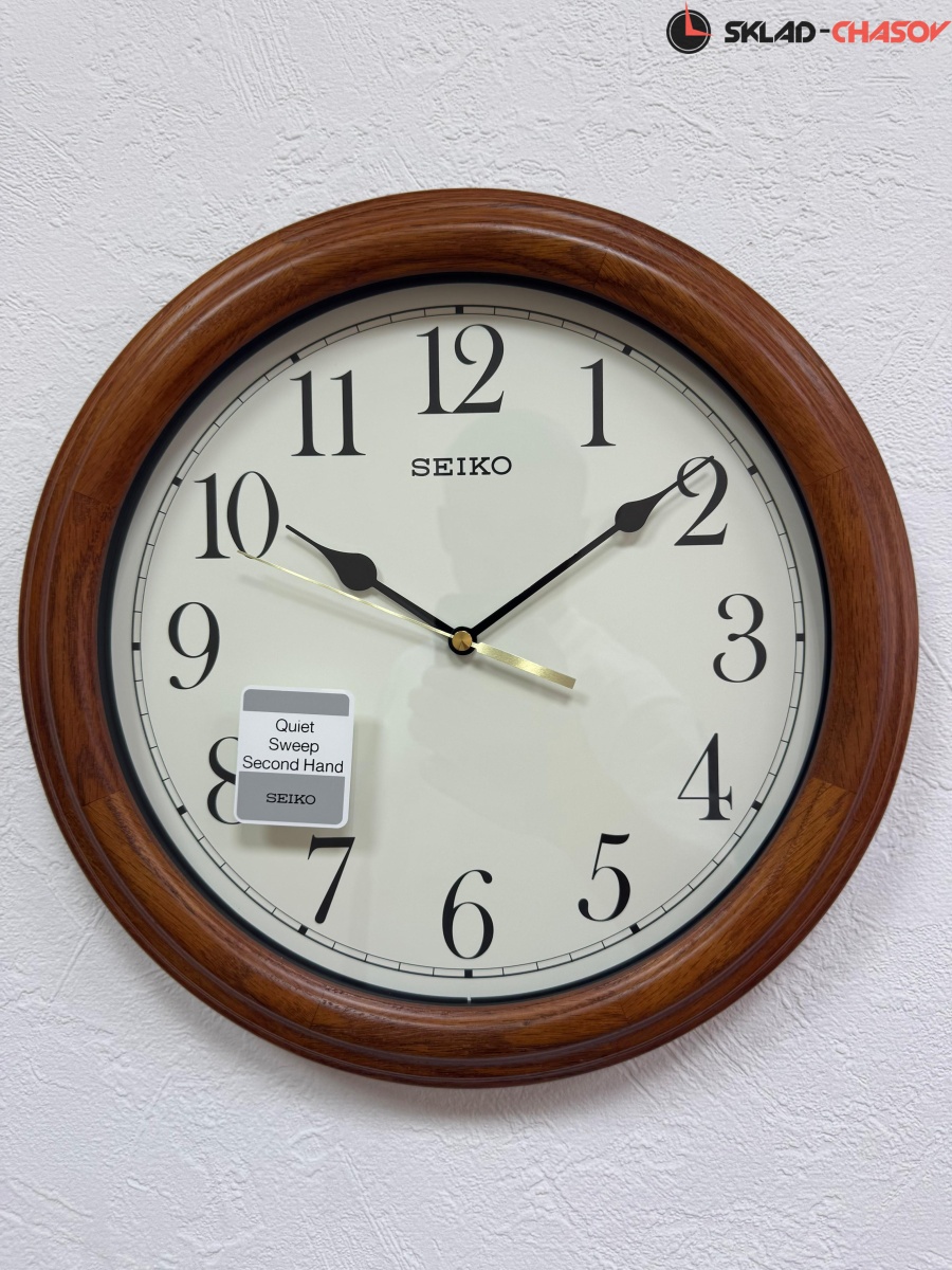 Настенные часы SEIKO QXA528B с аналоговым циферблатом (стрелки). Стрелки: черная часовая, черная минутная и золотистая секундная. Белый циферблат с черными арабскими цифрами. Плавный ход секундной стрелки. Бесшумный механизм. Корпус выполнен из дерева.