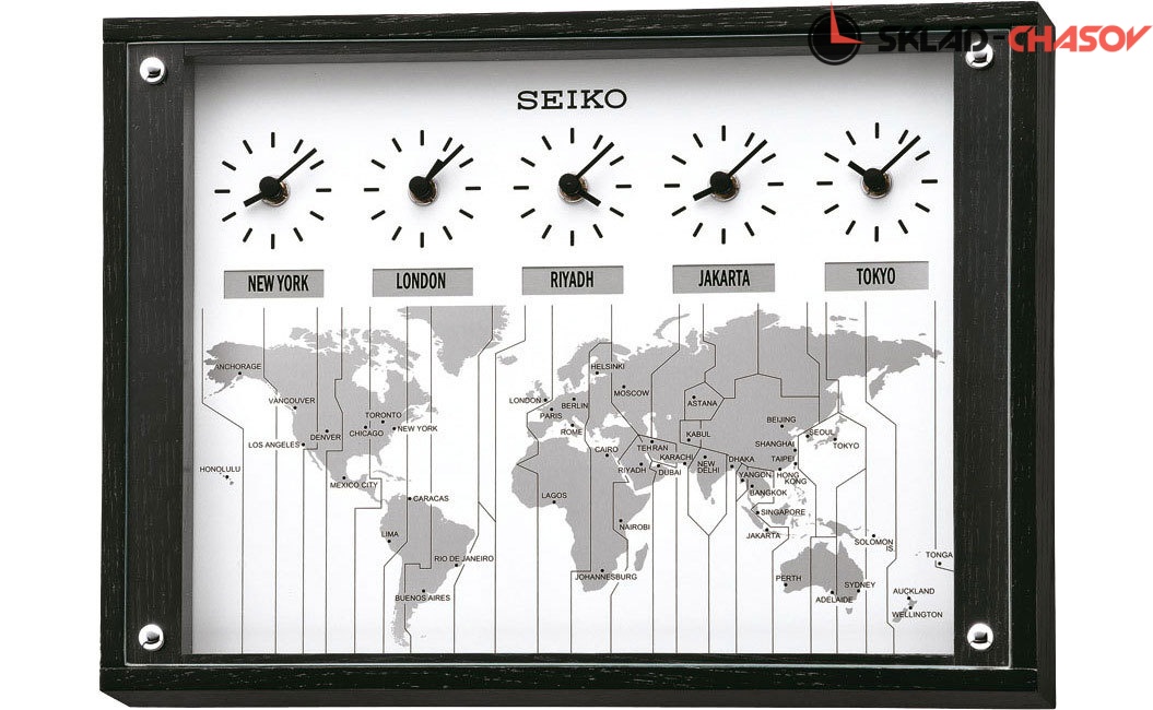 Мировое время. Поставляется с подставкой для установки на стол. Тип механизма: кварцевый. Корпус: дерево. Циферблат: белый. Ширина: 38см. Высота: 27,5см. Глубина: 4,5см.
