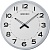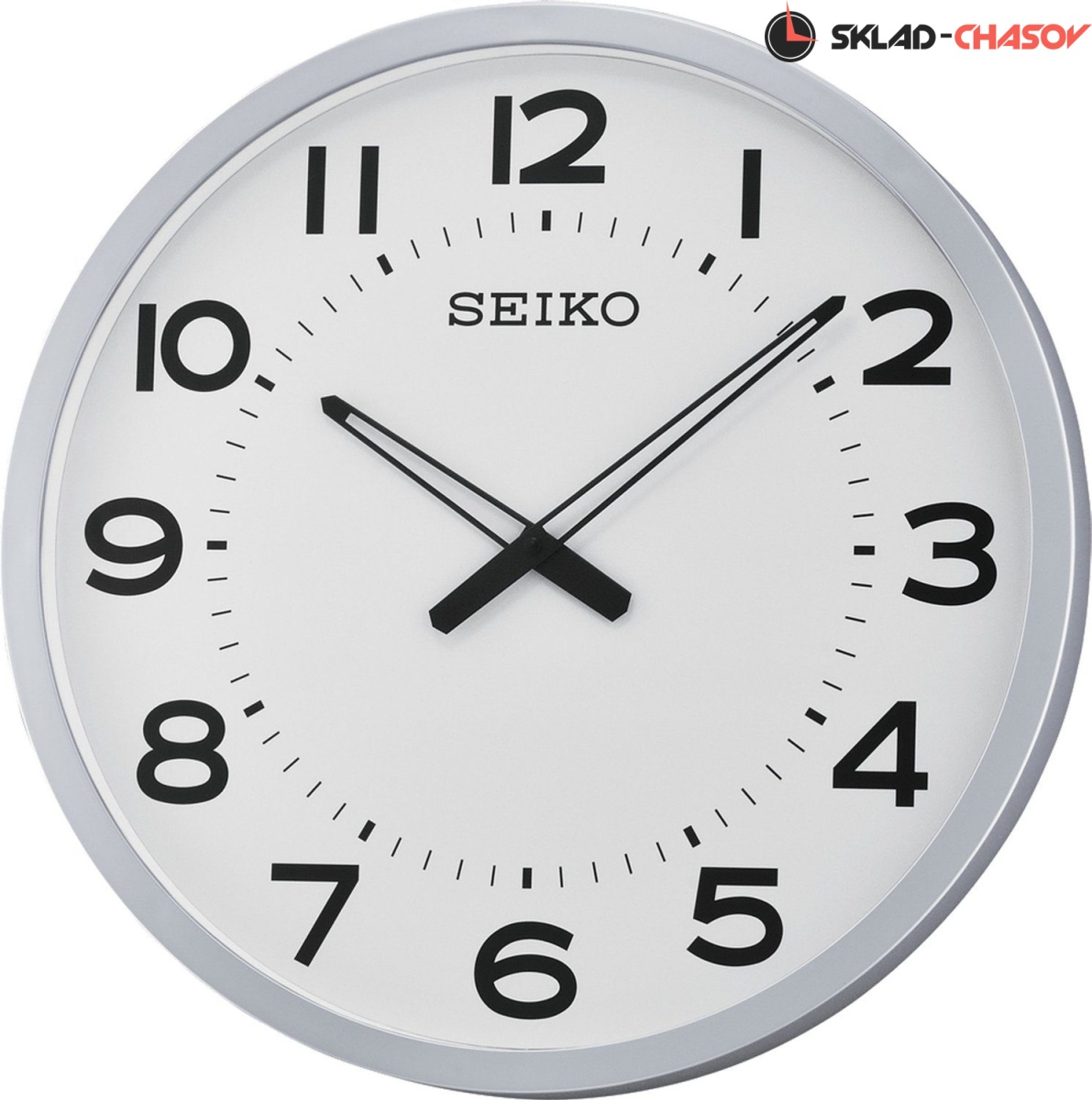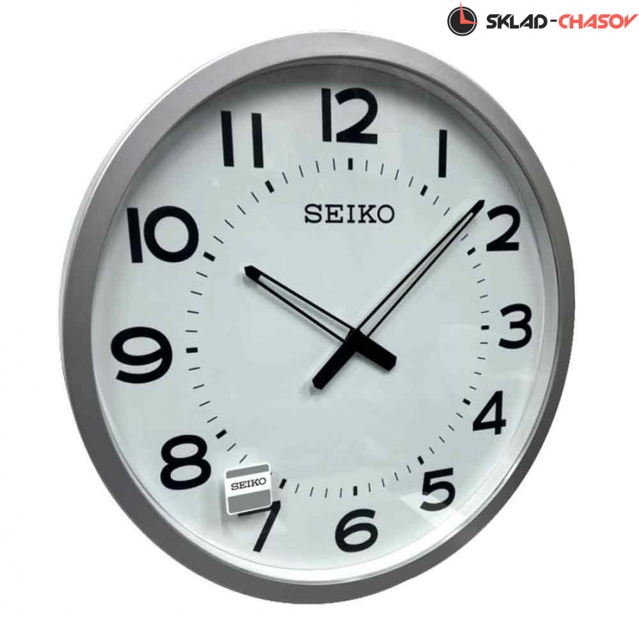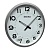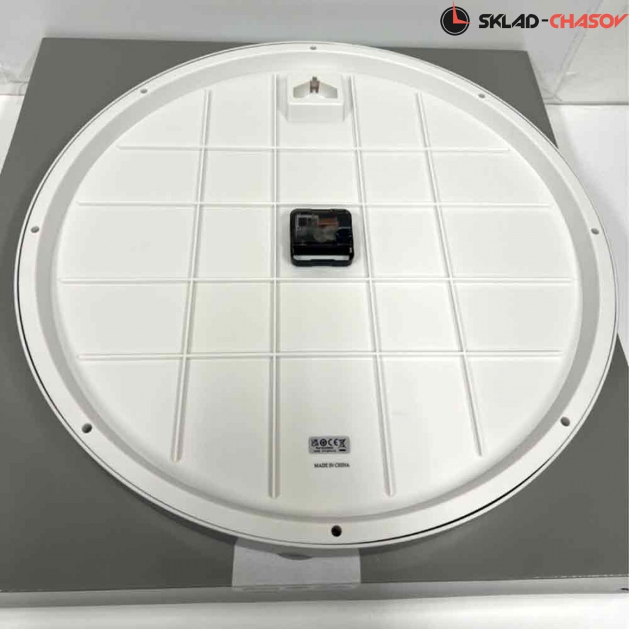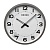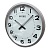 Серебристые настенные кварцевые часы с аналоговым циферблатом (стрелки). Стрелки: черная часовая и черная минутная. На белом циферблате черные арабские цифры. Корпус выполнен из пластика.