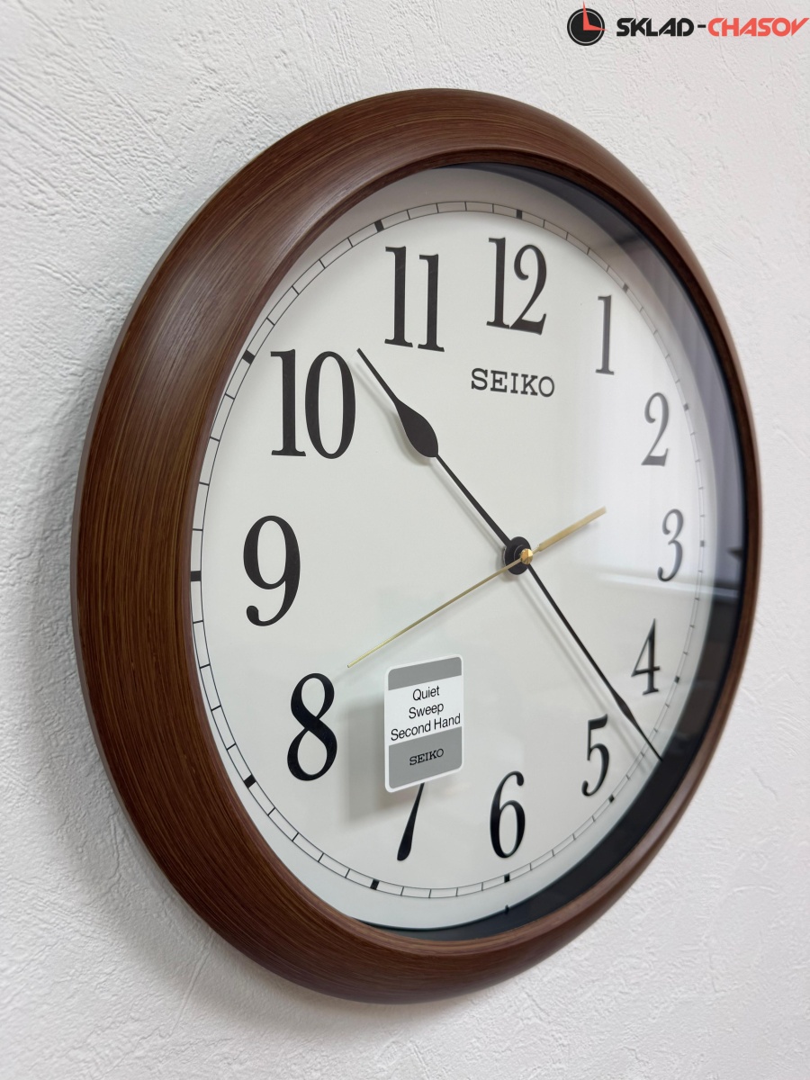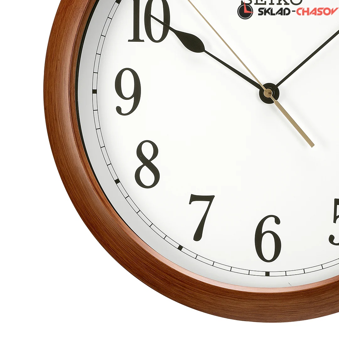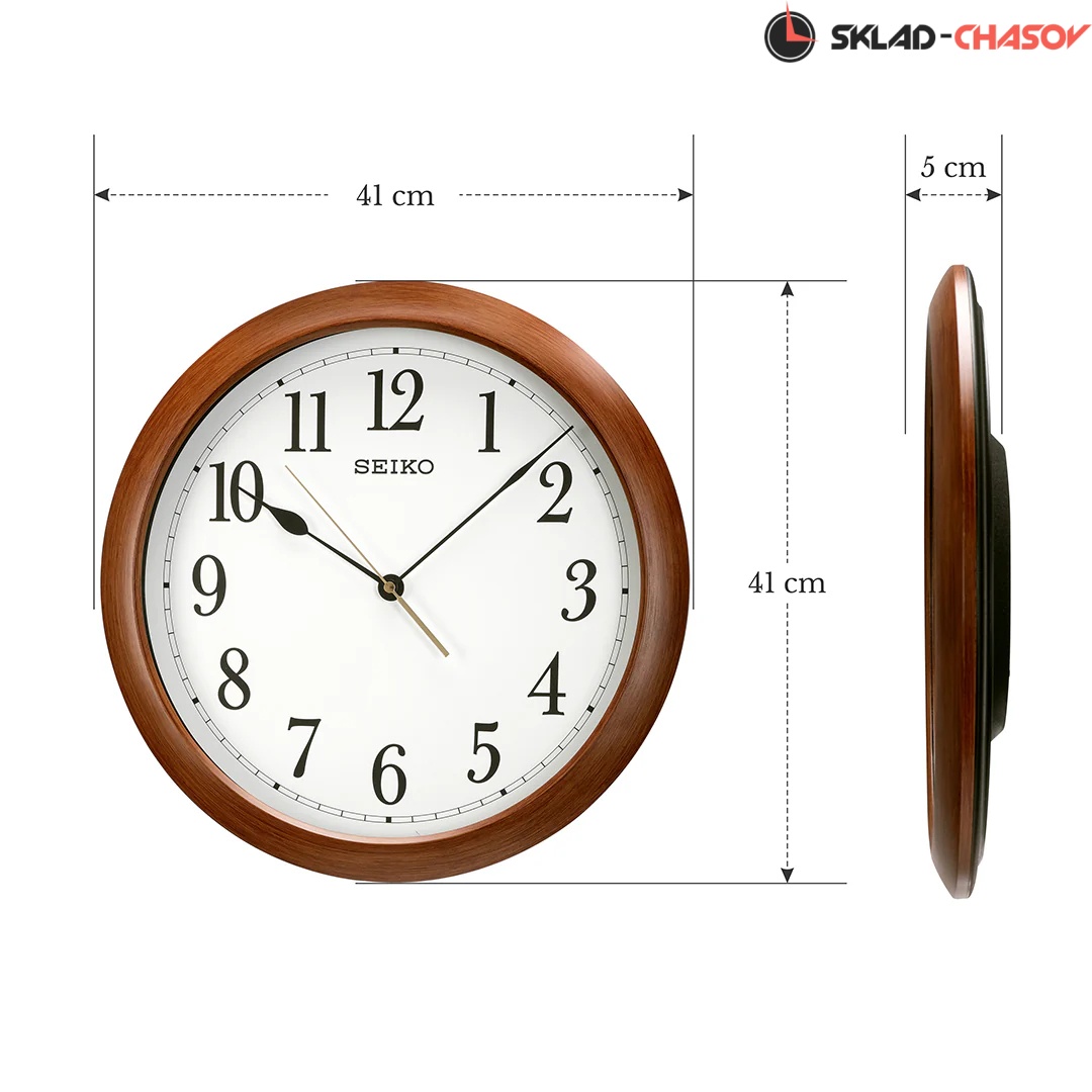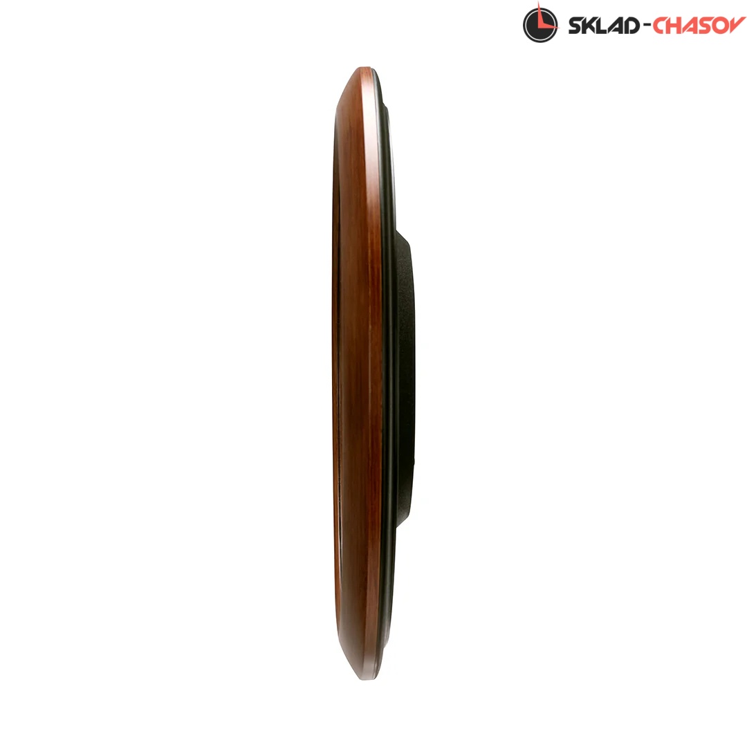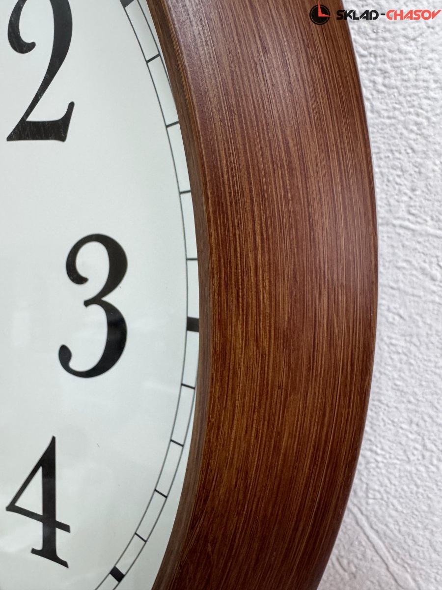 Коричневые кварцевые настенные часы с аналоговым циферблатом (стрелки). Стрелки: черная часовая, черная минутная и золотистая секундная. Пластиковый корпус с отделкой под дерево. Плавный ход секундной стрелки. Бесшумный механизм. Диаметр корпуса 41см, толщина 5 см.