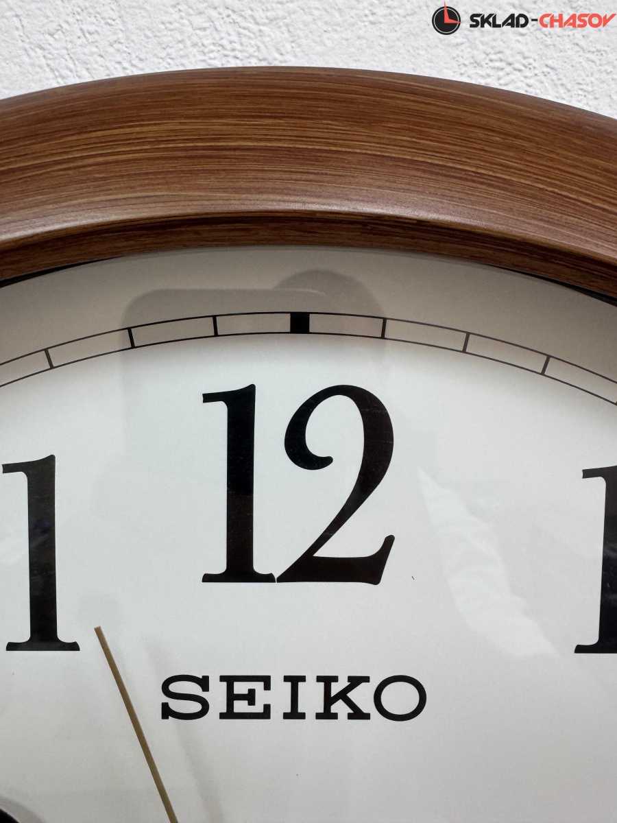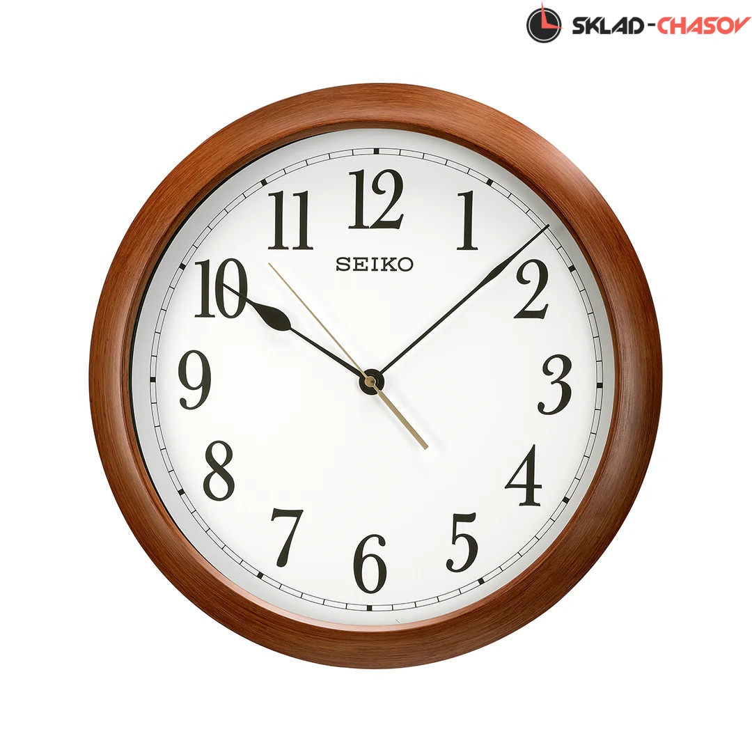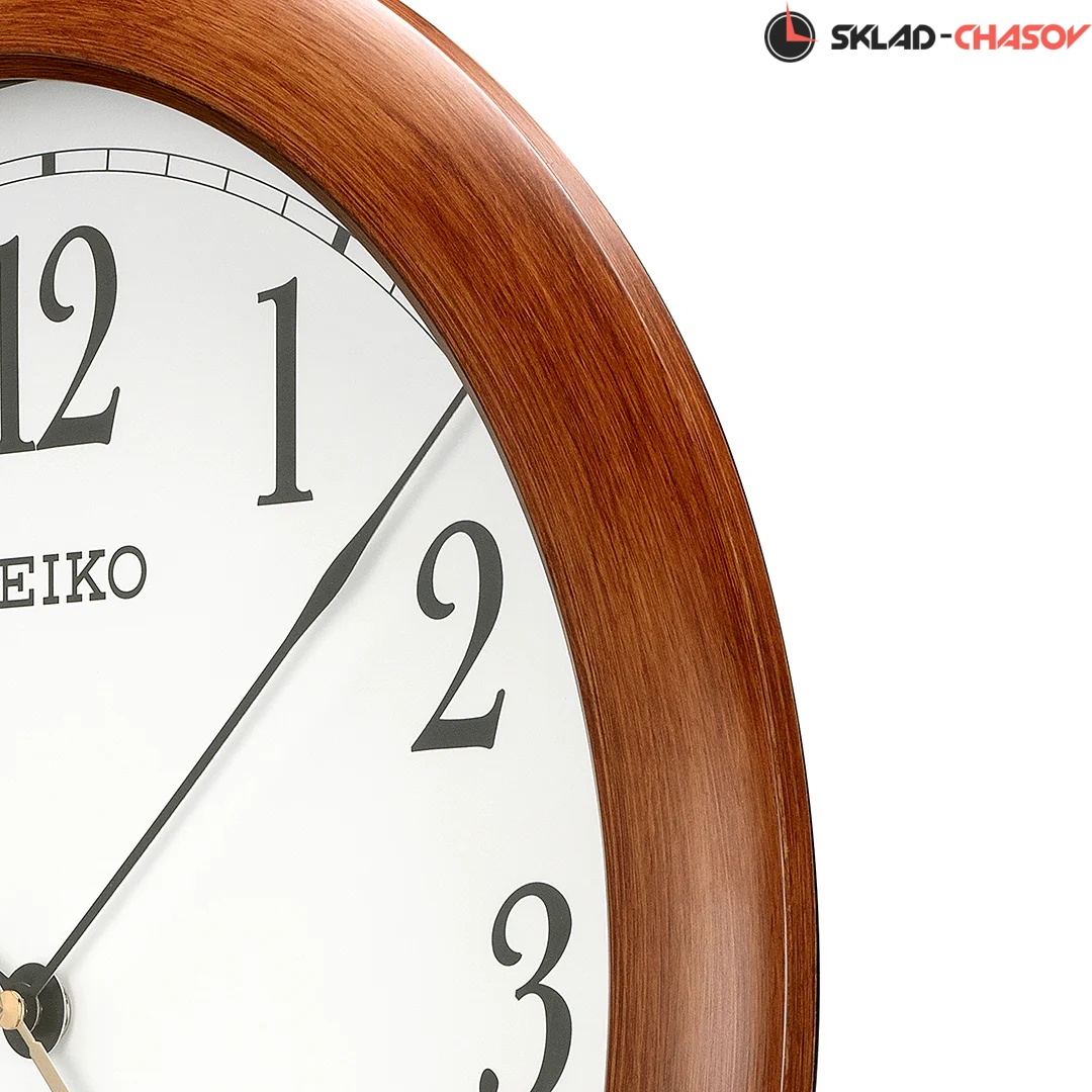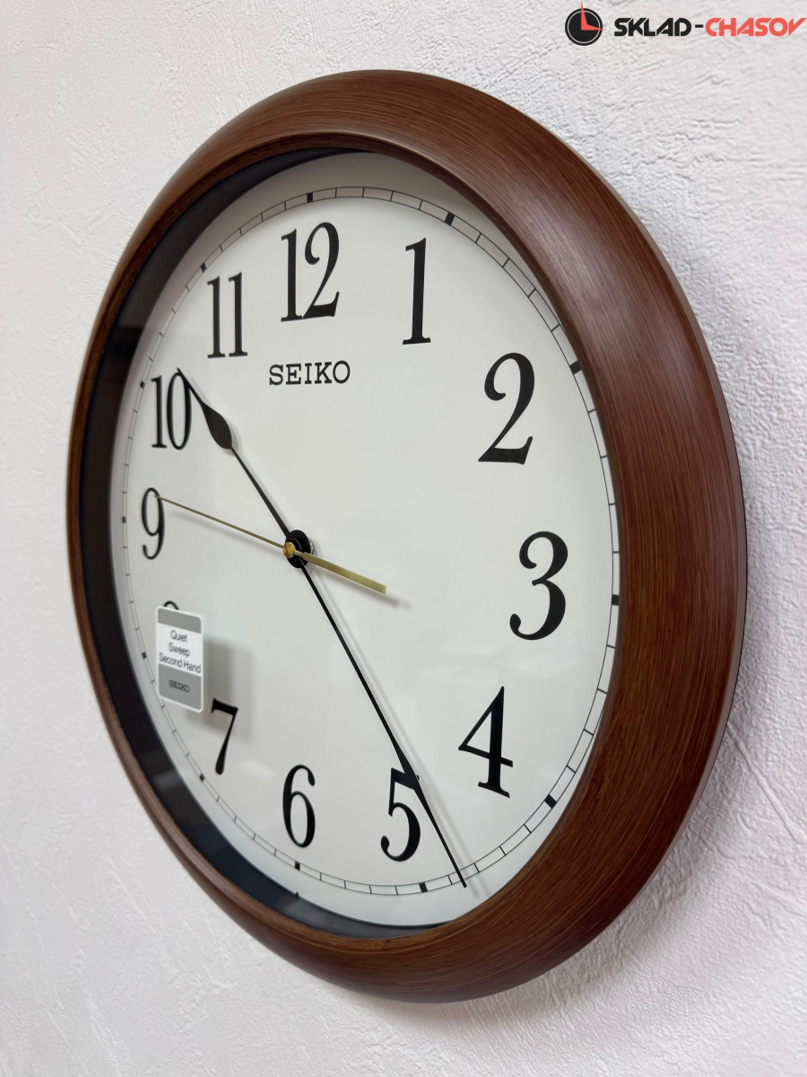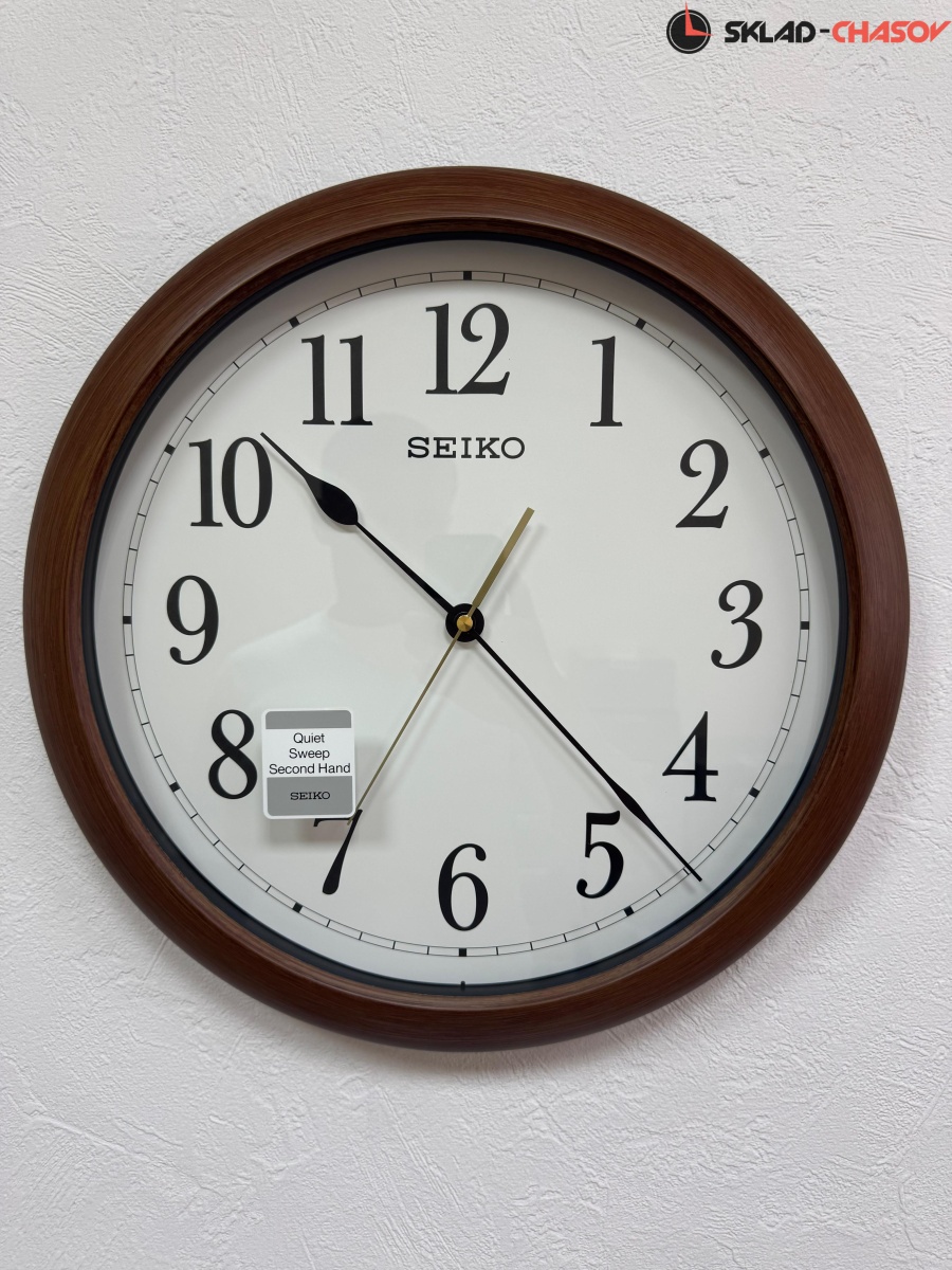 Коричневые кварцевые настенные часы с аналоговым циферблатом (стрелки). Стрелки: черная часовая, черная минутная и золотистая секундная. Пластиковый корпус с отделкой под дерево. Плавный ход секундной стрелки. Бесшумный механизм. Диаметр корпуса 41см, толщина 5 см.
